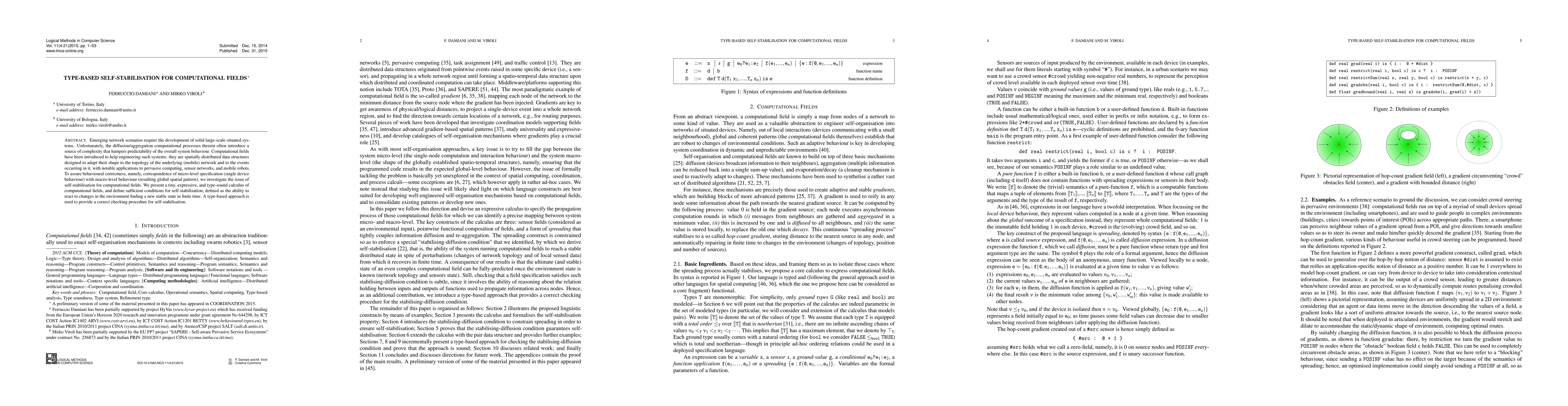 Emerging network scenarios require the development of solid large-scale situated systems. Unfortunately, the diffusion/aggregation computational processes therein often introduce a source of complexity that hampers predictability of the overall system behaviour. Computational fields have been introduced to help engineering such systems: they are spatially distributed data structures designed to adapt their shape to the topology of the underlying (mobile) network and to the events occurring in it, with notable applications to pervasive computing, sensor networks, and mobile robots. To assure behavioural correctness, namely, correspondence of micro-level specification (single device behaviour) with macro-level behaviour (resulting global spatial pattern), we investigate the issue of self-stabilisation for computational fields. We present a tiny, expressive, and type-sound calculus of computational fields, and define sufficient conditions for self-stabilisation, defined as the ability to react to changes in the environment finding a new stable state in finite time. A type-based approach is used to provide a correct checking procedure for self-stabilisation.