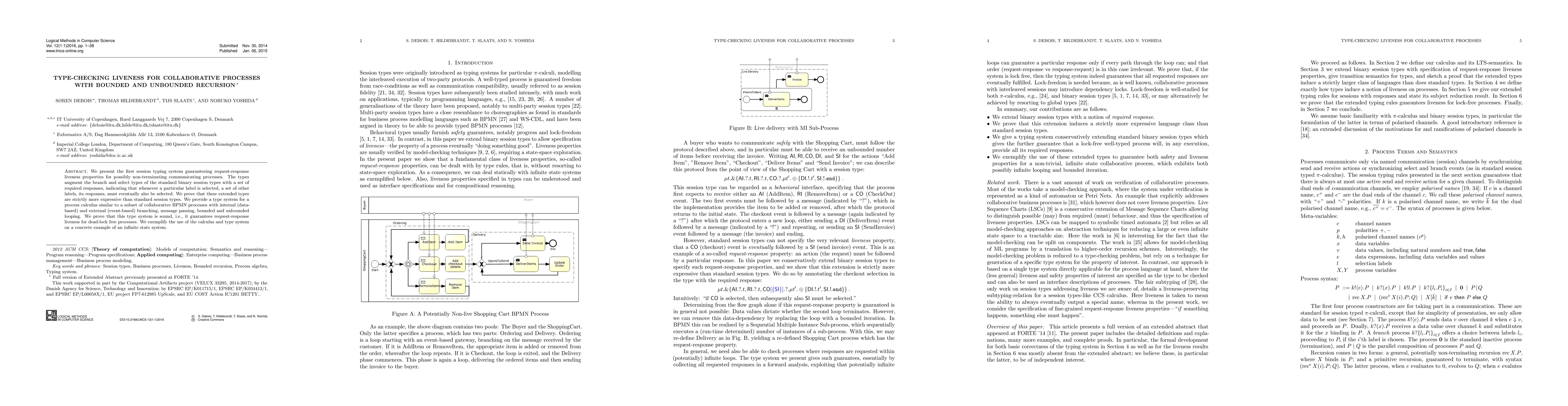 We present the first session typing system guaranteeing request-response liveness properties for possibly non-terminating communicating processes. The types augment the branch and select types of the standard binary session types with a set of required responses, indicating that whenever a particular label is selected, a set of other labels, its responses, must eventually also be selected. We prove that these extended types are strictly more expressive than standard session types. We provide a type system for a process calculus similar to a subset of collaborative BPMN processes with internal (data-based) and external (event-based) branching, message passing, bounded and unbounded looping. We prove that this type system is sound, i.e., it guarantees request-response liveness for dead-lock free processes. We exemplify the use of the calculus and type system on a concrete example of an infinite state system.