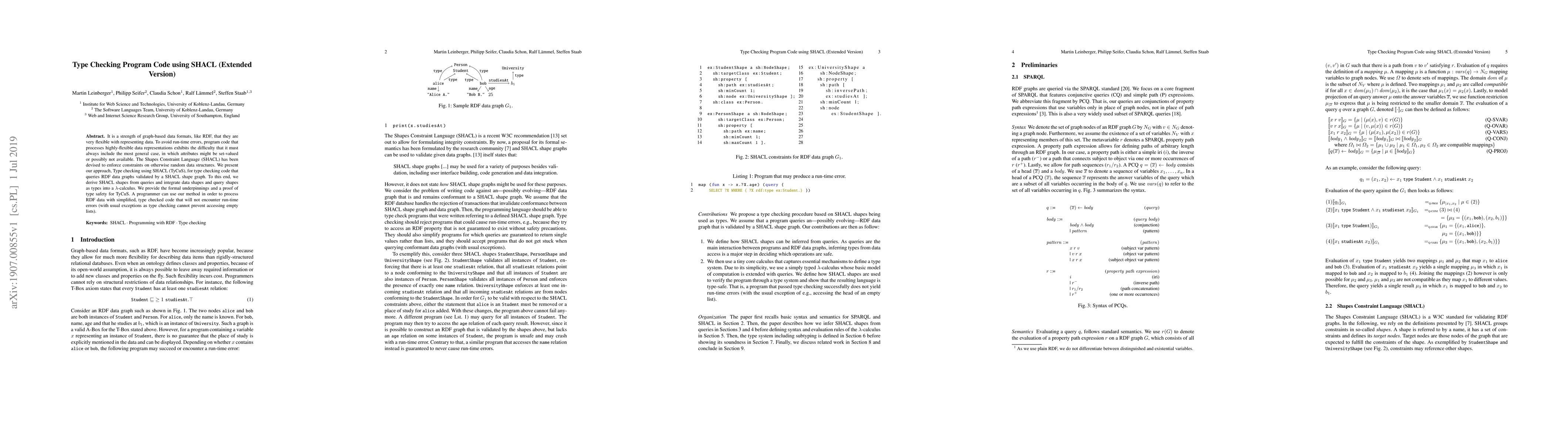 It is a strength of graph-based data formats, like RDF, that they are very flexible with representing data. To avoid run-time errors, program code that processes highly-flexible data representations exhibits the difficulty that it must always include the most general case, in which attributes might be set-valued or possibly not available. The Shapes Constraint Language (SHACL) has been devised to enforce constraints on otherwise random data structures. We present our approach, Type checking using SHACL (TyCuS), for type checking code that queries RDF data graphs validated by a SHACL shape graph. To this end, we derive SHACL shapes from queries and integrate data shapes and query shapes as types into a $\lambda$-calculus. We provide the formal underpinnings and a proof of type safety for TyCuS. A programmer can use our method in order to process RDF data with simplified, type checked code that will not encounter run-time errors (with usual exceptions as type checking cannot prevent accessing empty lists).