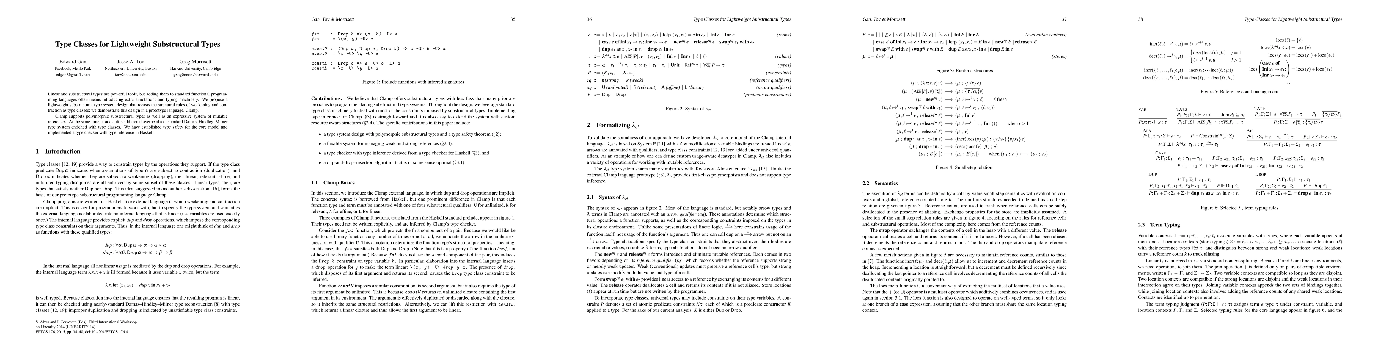 This research introduces a lightweight substructural type system design, recasting structural rules as type classes, demonstrated in the prototype language Clamp. It supports polymorphic substructural types and mutable references with minimal overhead to a standard Damas-Hindley-Milner type system, proven type-safe and implemented with type inference in Haskell.