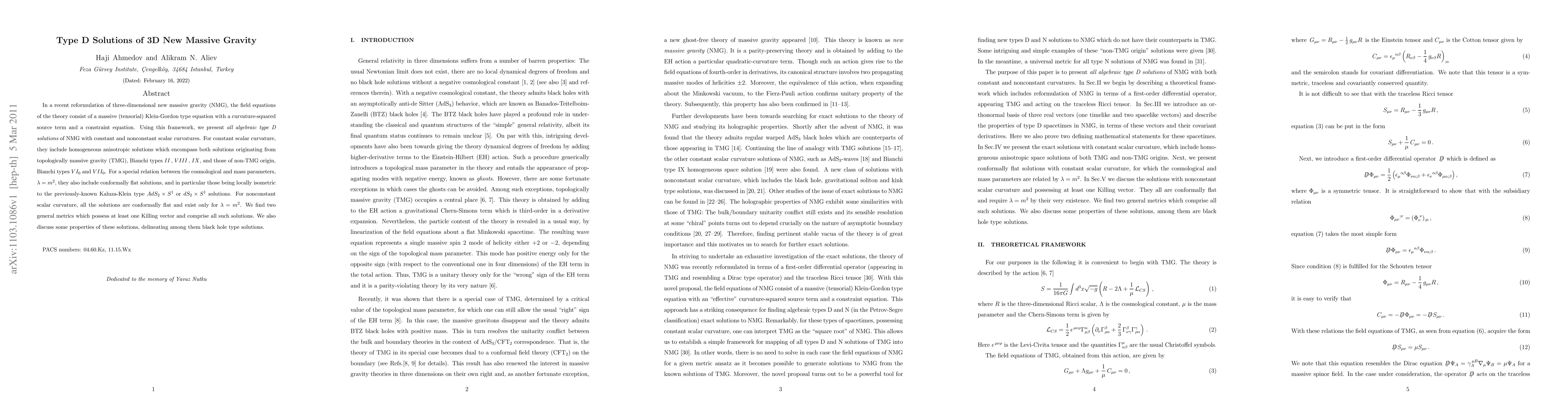 In a recent reformulation of three-dimensional new massive gravity (NMG), the field equations of the theory consist of a massive (tensorial) Klein-Gordon type equation with a curvature-squared source term and a constraint equation. Using this framework, we present all algebraic type D solutions of NMG with constant and nonconstant scalar curvatures. For constant scalar curvature, they include homogeneous anisotropic solutions which encompass both solutions originating from topologically massive gravity (TMG), Bianchi types II, VIII, IX, and those of non-TMG origin, Bianchi types VI_{0} and VII_{0} . For a special relation between the cosmological and mass parameters, \lambda=m^2, they also include conformally flat solutions, and in particular those being locally isometric to the previously-known Kaluza-Klein type AdS_2xS^1 or dS_2x S^1 solutions. For nonconstant scalar curvature, all the solutions are conformally flat and exist only for \lambda=m^2 . We find two general metrics which possess at least one Killing vector and comprise all such solutions. We also discuss some properties of these solutions, delineating among them black hole type solutions.