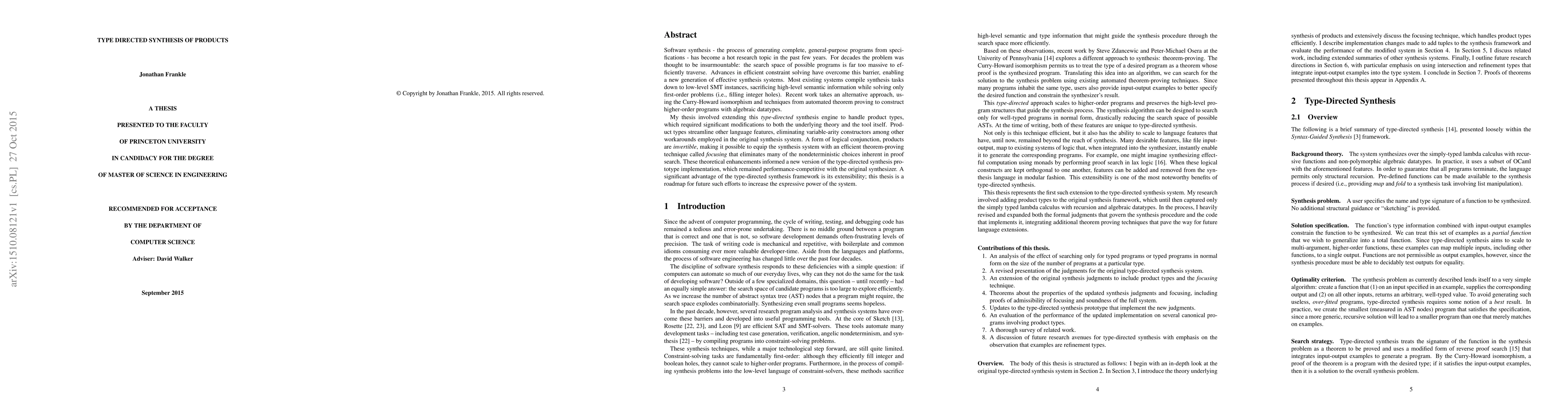 This research extends a type-directed software synthesis engine to handle product types, enhancing the system’s ability to generate higher-order programs with algebraic datatypes. The improvements leverage efficient theorem-proving techniques like focusing to maintain competitive performance.