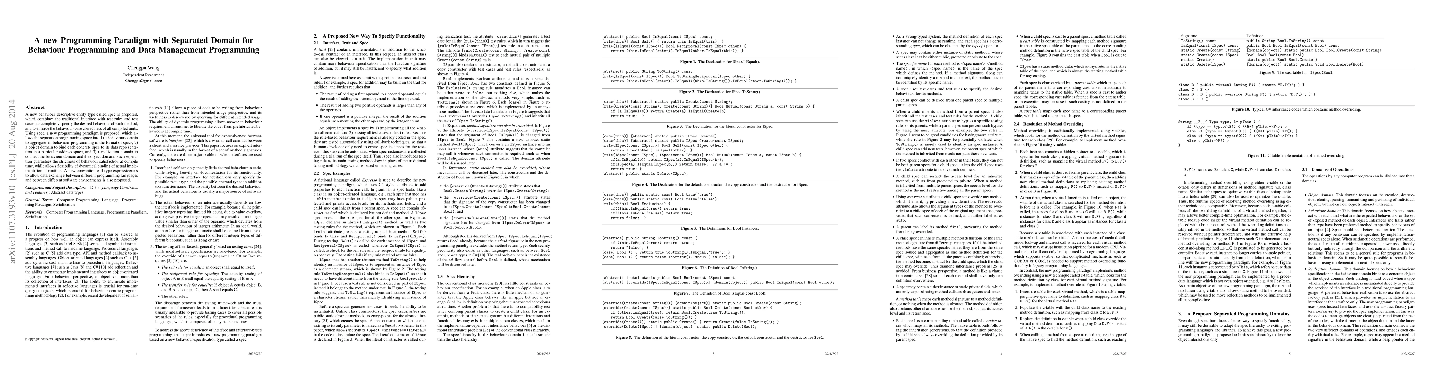 A new behavior descriptive entity type called spec is proposed, which combines the traditional interface with test rules and test cases, to completely specify the desired behavior of each method, and to enforce the behavior-wise correctness of all compiled units. Using spec, a new programming paradigm is proposed, which allows the separation programming space into 1) a behavior domain to aggregate all behavior programming in the format of specs, 2) a object domain to bind each concrete spec to its data representation in a particular address space, and 3) a realization domain to connect the behavior domain and the object domain. Such separation guarantees the strictness of behavior satisfaction at compile time, while allows flexibility of dynamical binding of actual implementation at runtime. A new convention call type expressiveness to allow data exchange between different programming languages and between different software environments is also proposed.