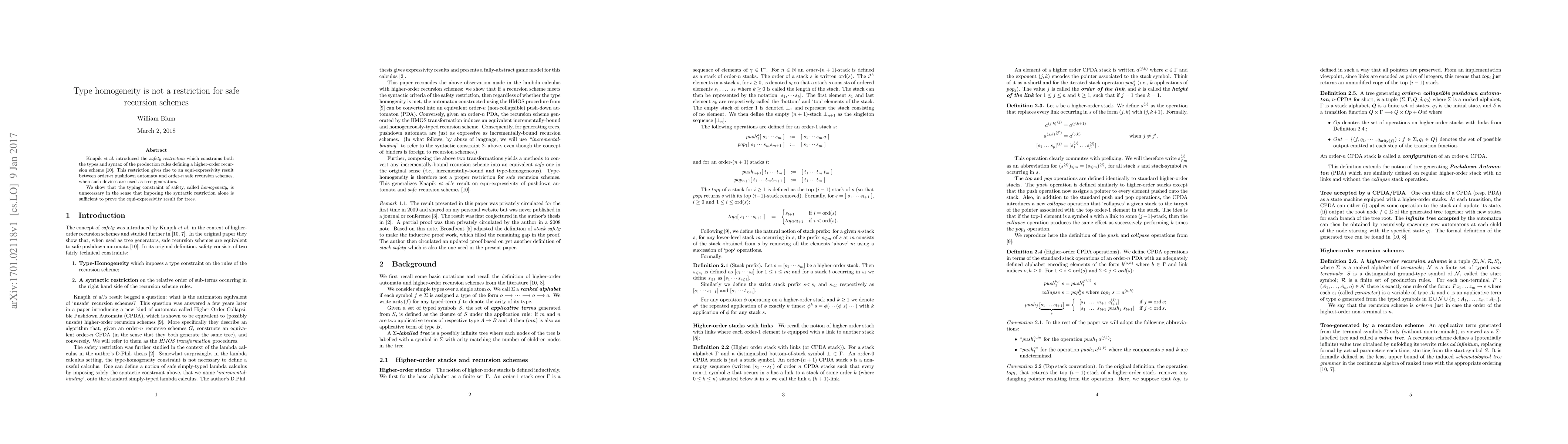 Knapik et al. introduced the safety restriction which constrains both the types and syntax of the production rules defining a higher-order recursion scheme. This restriction gives rise to an equi-expressivity result between order-n pushdown automata and order-n safe recursion schemes, when such devices are used as tree generators. We show that the typing constraint of safety, called homogeneity, is unnecessary in the sense that imposing the syntactic restriction alone is sufficient to prove the equi-expressivity result for trees.
