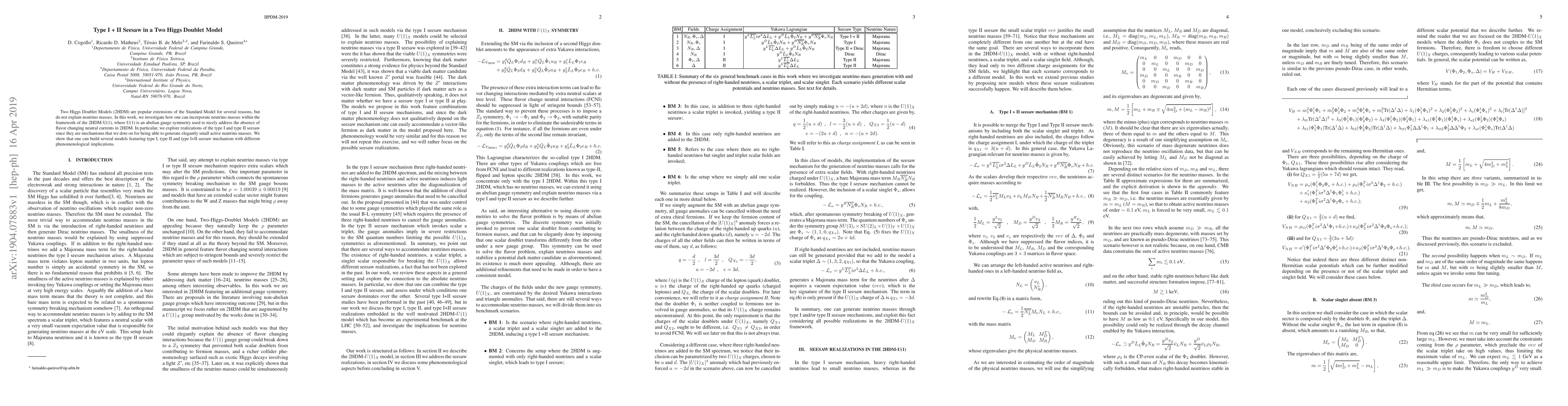 This paper explores the incorporation of neutrino masses within a Two Higgs Doublet Model extended by an abelian U(1) symmetry, focusing on the type I, type II, and combined type I+II seesaw mechanisms to generate small active neutrino masses. It demonstrates various model configurations with distinct phenomenological consequences.