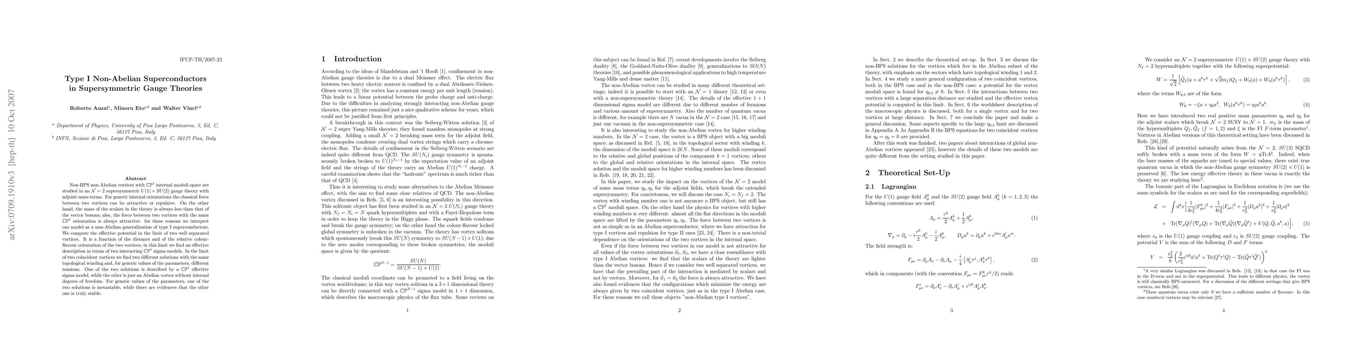 This paper studies non-BPS non-Abelian vortices in an N=2 supersymmetric gauge theory, interpreting the model as a non-Abelian generalization of type I superconductors due to attractive forces between vortices with the same orientation. It computes the effective potential for separated vortices and finds two distinct solutions for coincident vortices, one metastable and the other stable.