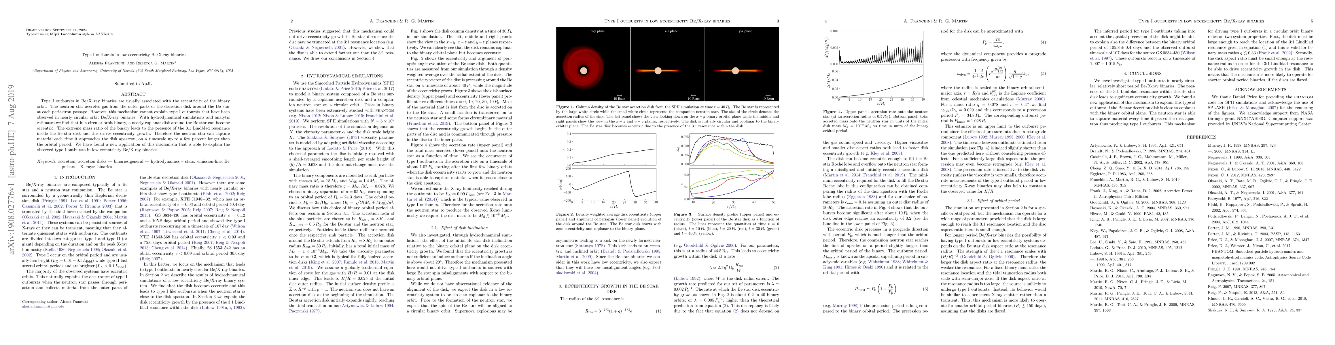 This paper investigates the mechanism behind Type I outbursts in Be/X-ray binaries with nearly circular orbits, finding that eccentricity in the Be star's disk, driven by the 3:1 Lindblad resonance, can explain these outbursts despite low orbital eccentricity. This new mechanism allows for neutron star accretion at apastron, extending the traditional periastron-only model.