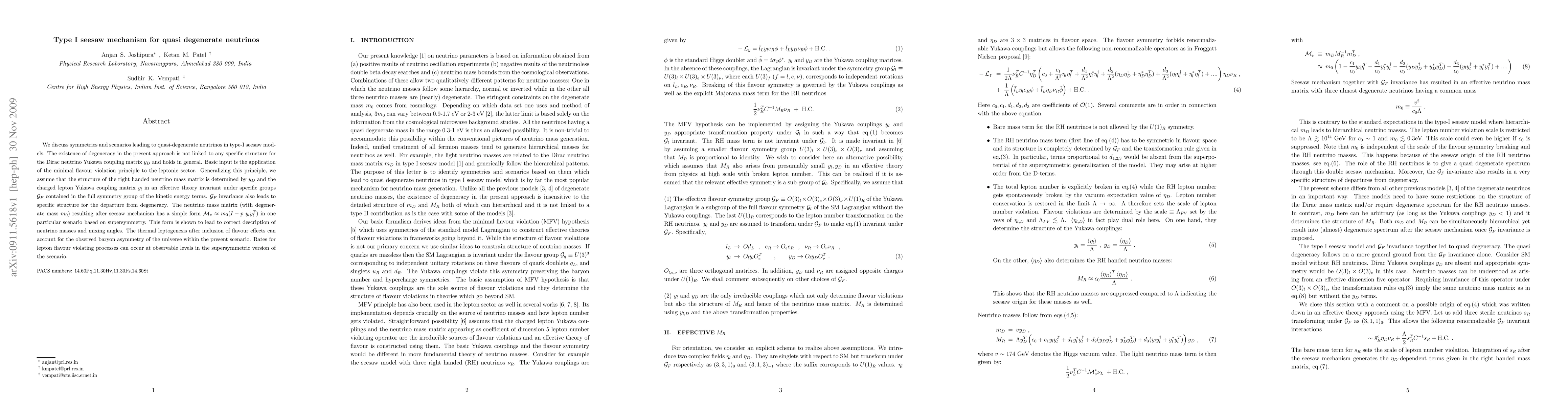 This paper explores symmetries and scenarios in type-I seesaw models that lead to quasi-degenerate neutrinos, emphasizing minimal flavour violation and its implications for the neutrino mass matrix. The study shows that the resulting mass matrix can describe observed neutrino masses and mixing angles, while also enabling thermal leptogenesis and potentially observable lepton flavour violation rates.