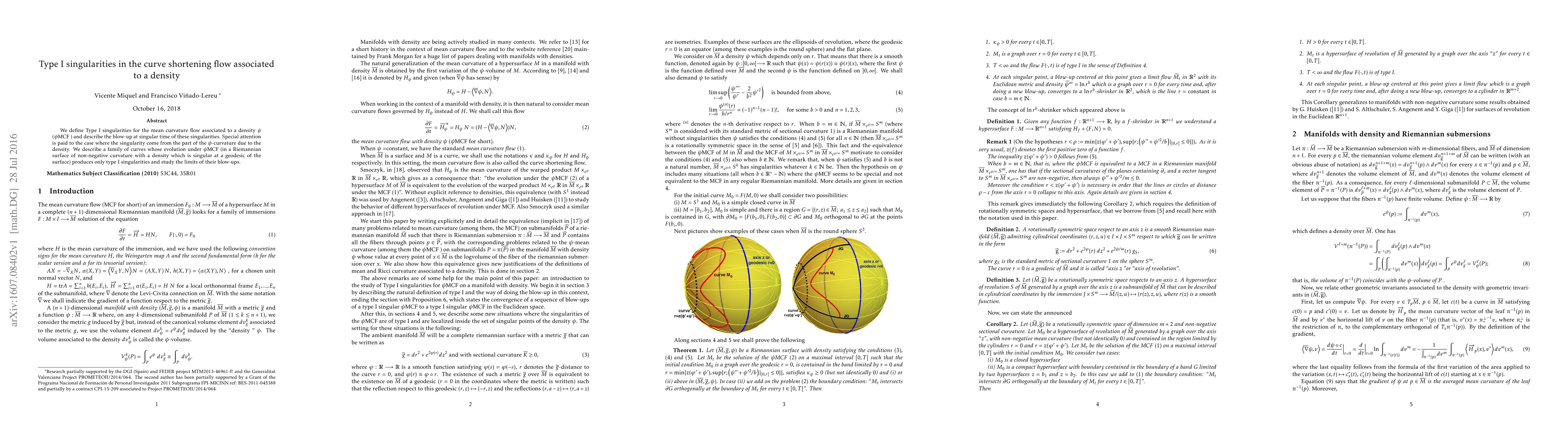 We define Type I singularities for the mean curvature flow associated to a density $\psi$ ($\psi$MCF) and describe the blow-up at singular time of these singularities. Special attention is paid to the case where the singularity come from the part of the $\psi$-curvature due to the density. We describe a family of curves whose evolution under $\psi$MCF (in a Riemannian surface of non-negative curvature with a density which is singular at a geodesic of the surface) produces only type I singularities and study the limits of their blow-ups.