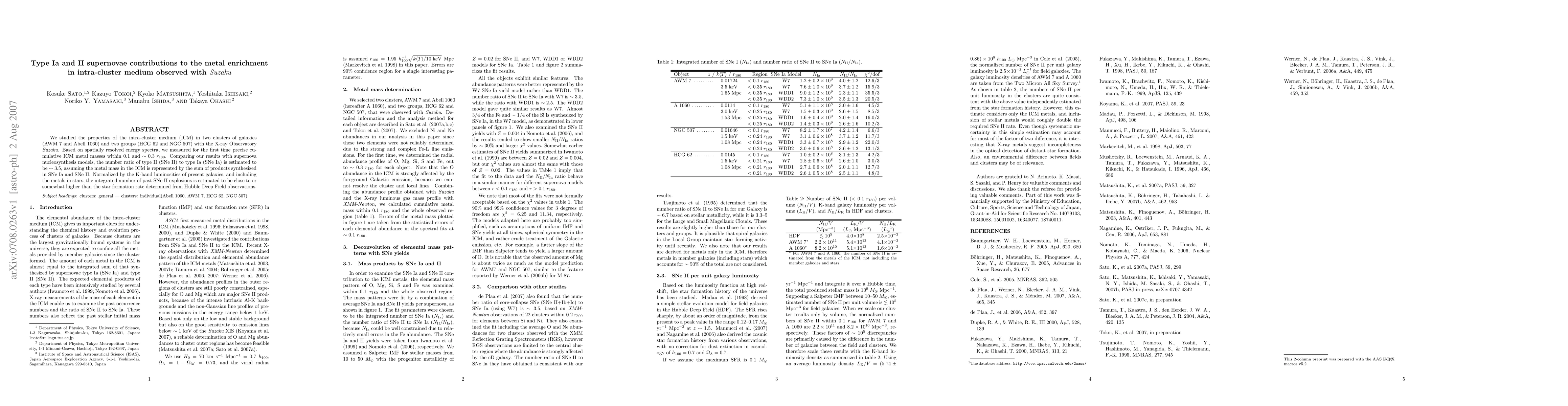 We studied the properties of the intra-cluster medium (ICM) in two clusters of galaxies (AWM 7 and Abell 1060) and two groups (HCG 62 and NGC 507) with the X-ray Observatory Suzaku. Based on spatially resolved energy spectra, we measured for the first time precise cumulative ICM metal masses within 0.1 and ~0.3 r_{180}. Comparing our results with supernova nucleosynthesis models, the number ratio of type II (SNe II) to type Ia (SNe Ia) is estimated to be ~3.5, assuming the metal mass in the ICM is represented by the sum of products synthesized in SNe Ia and SNe II. Normalized by the K-band luminosities of present galaxies, and including the metals in stars, the integrated number of past SNe II explosions is estimated to be close to or somewhat higher than the star formation rate determined from Hubble Deep Field observations.