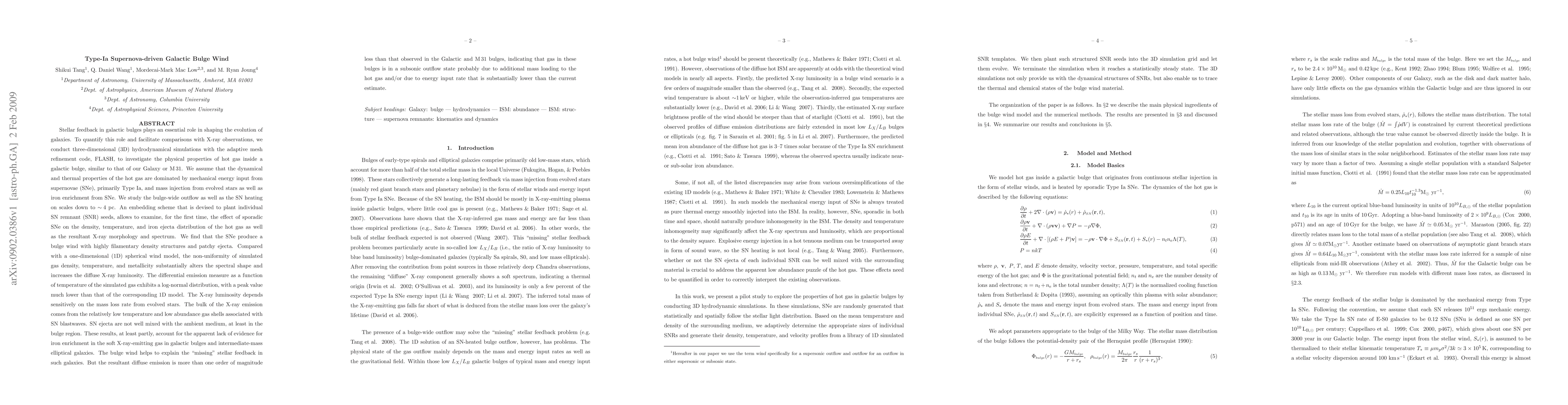 Stellar feedback in galactic bulges plays an essential role in shaping the evolution of galaxies. To quantify this role and facilitate comparisons with X-ray observations, we conduct 3D hydrodynamical simulations with the adaptive mesh refinement code, FLASH, to investigate the physical properties of hot gas inside a galactic bulge, similar to that of our Galaxy or M31. We assume that the dynamical and thermal properties of the hot gas are dominated by mechanical energy input from SNe, primarily Type Ia, and mass injection from evolved stars as well as iron enrichment from SNe. We study the bulge-wide outflow as well as the SN heating on scales down to ~4 pc. An embedding scheme that is devised to plant individual SNR seeds, allows to examine, for the first time, the effect of sporadic SNe on the density, temperature, and iron ejecta distribution of the hot gas as well as the resultant X-ray morphology and spectrum. We find that the SNe produce a bulge wind with highly filamentary density structures and patchy ejecta. Compared with a 1D spherical wind model, the non-uniformity of simulated gas density, temperature, and metallicity substantially alters the spectral shape and increases the diffuse X-ray luminosity. The differential emission measure as a function of temperature of the simulated gas exhibits a log-normal distribution, with a peak value much lower than that of the corresponding 1D model. The bulk of the X-ray emission comes from the relatively low temperature and low abundance gas shells associated with SN blastwaves. SN ejecta are not well mixed with the ambient medium, at least in the bulge region. These results, at least partly, account for the apparent lack of evidence for iron enrichment in the soft X-ray-emitting gas in galactic bulges and intermediate-mass elliptical galaxies.[...]