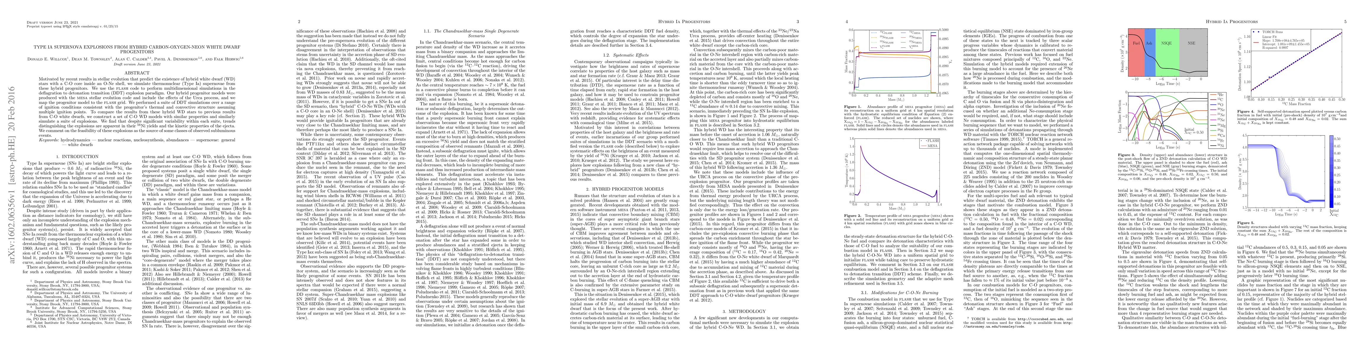 Motivated by recent results in stellar evolution that predict the existence of hybrid white dwarf (WD) stars with a C-O core inside an O-Ne shell, we simulate thermonuclear (Type Ia) supernovae from these hybrid progenitors. We use the FLASH code to perform multidimensional simulations in the deflagration to detonation transition (DDT) explosion paradigm. Our hybrid progenitor models were produced with the MESA stellar evolution code and include the effects of the Urca process, and we map the progenitor model to the FLASH grid. We performed a suite of DDT simulations over a range of ignition conditions consistent with the progenitor's thermal and convective structure assuming multiple ignition points. To compare the results from these hybrid WD stars to previous results from C-O white dwarfs, we construct a set of C-O WD models with similar properties and similarly simulate a suite of explosions. We find that despite significant variability within each suite, trends distinguishing the explosions are apparent in their $^{56}$Ni yields and the kinetic properties of the ejecta. We comment on the feasibility of these explosions as the source of some classes of observed subluminous events.