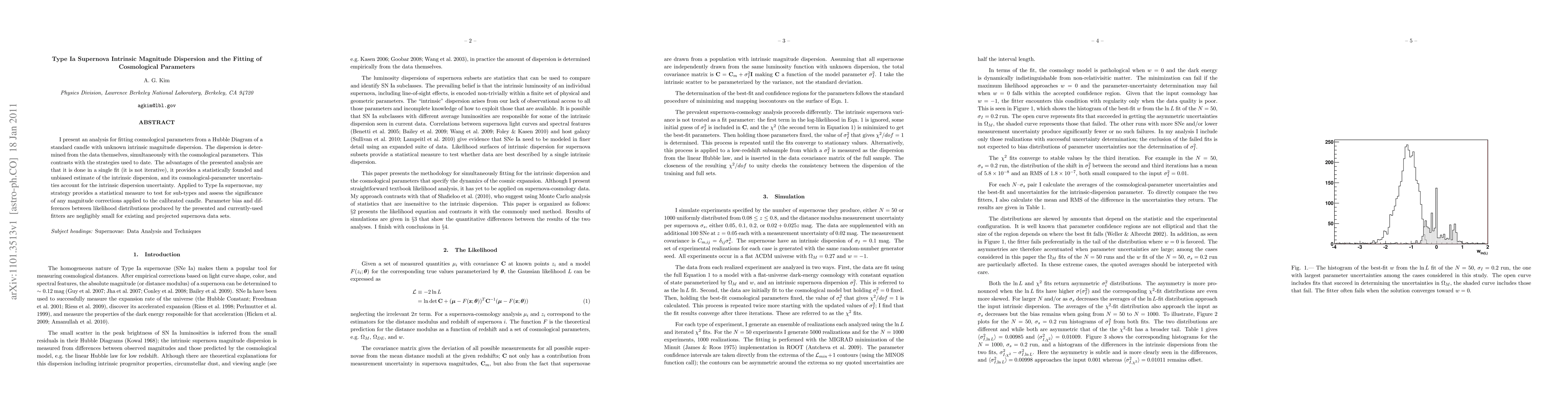 This paper proposes a novel method to fit cosmological parameters using Type Ia supernovae, determining intrinsic magnitude dispersion directly from the data in a single, non-iterative fit. This approach offers unbiased estimates and accounts for dispersion uncertainties, providing a robust statistical measure to test for supernova sub-types and assess magnitude corrections.