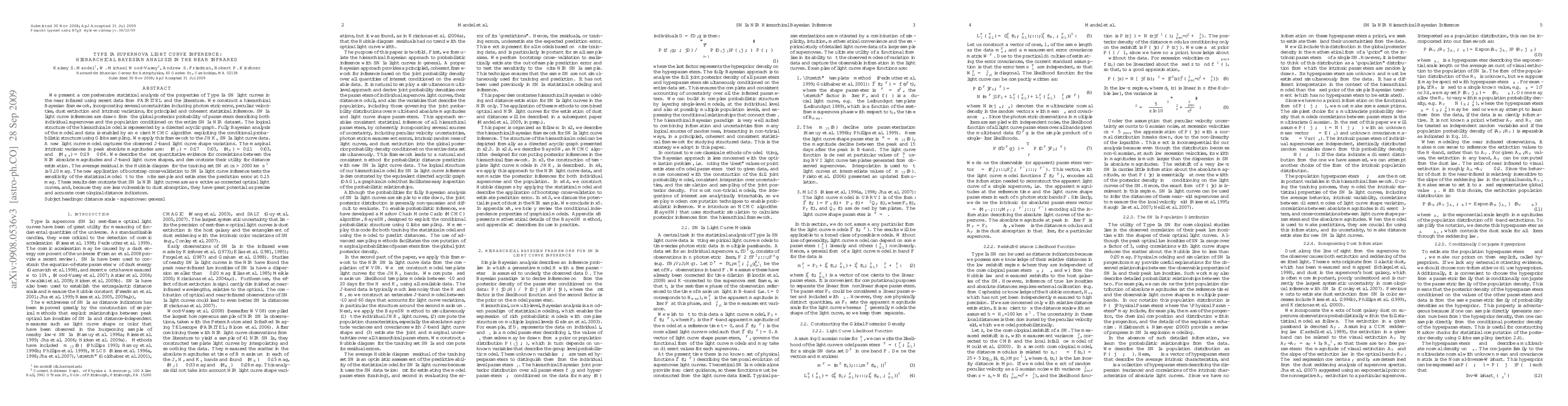 The paper proposes a hierarchical Bayesian model with an efficient MCMC algorithm for coherent statistical inference of SN Ia light curves in the NIR, capturing shape variations and quantifying intrinsic dispersions.