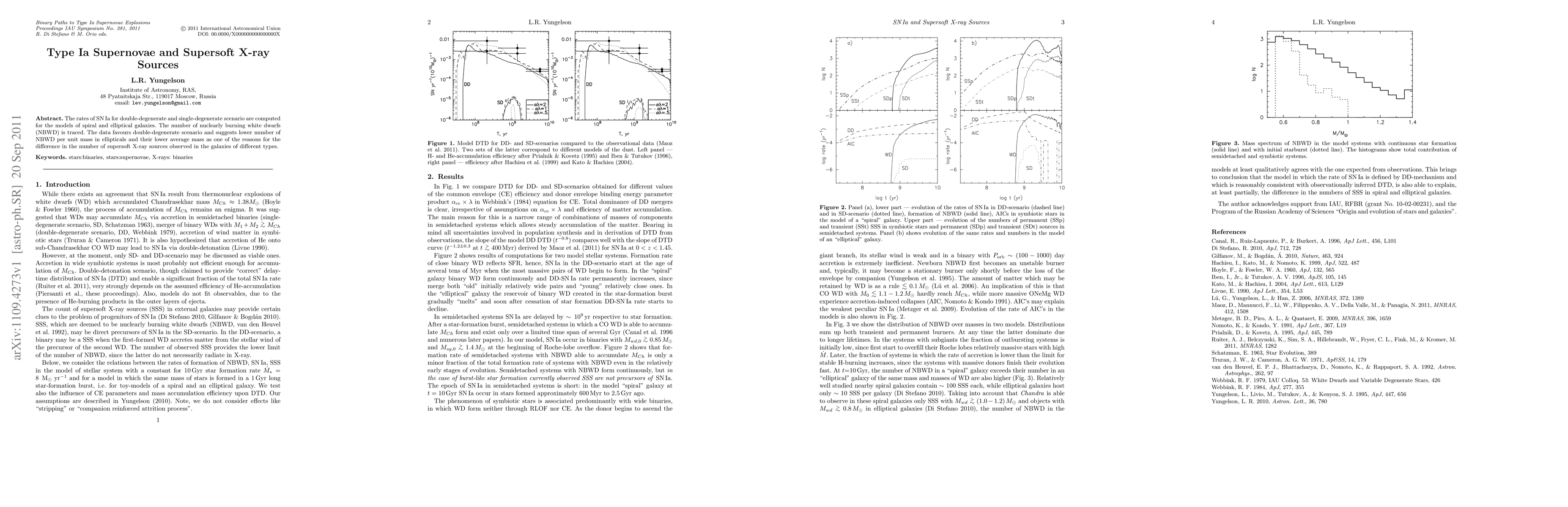 This research calculates SN Ia rates for double-degenerate and single-degenerate scenarios in spiral and elliptical galaxies. It finds that the data supports the double-degenerate scenario and suggests fewer nuclearly burning white dwarfs per unit mass in ellipticals, contributing to the observed difference in supersoft X-ray sources between galaxy types.