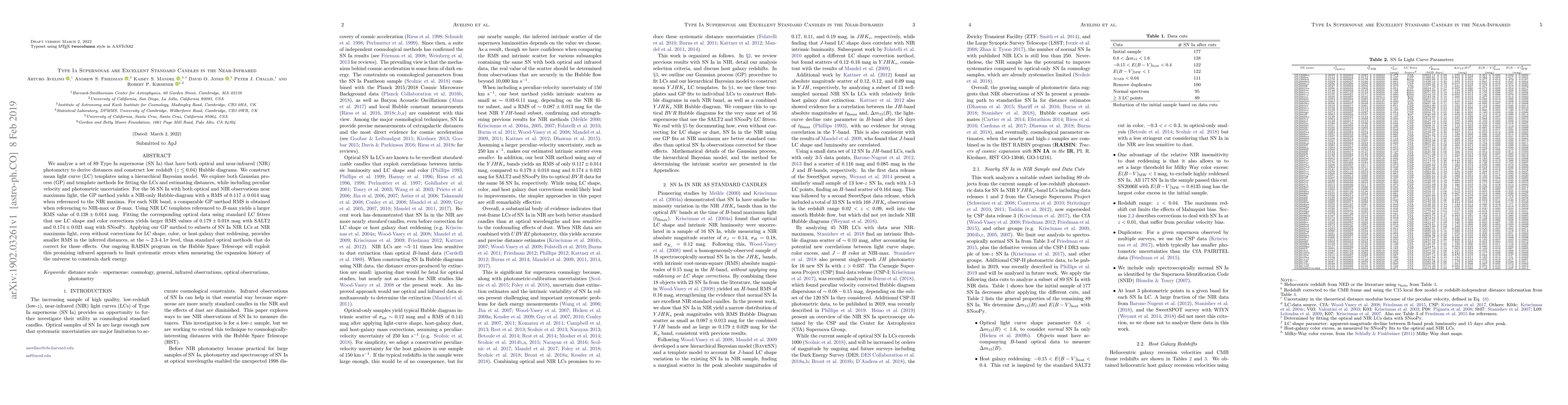 We analyze a set of 89 Type Ia supernovae (SN Ia) that have both optical and near-infrared (NIR) photometry to derive distances and construct low redshift ($z < 0.04$) Hubble diagrams. We construct mean light curve (LC) templates using a hierarchical Bayesian model. We explore both Gaussian process (GP) and template methods for fitting the LCs and estimating distances, while including peculiar velocity and photometric uncertainties. For the 56 SN Ia with both optical and NIR observations near maximum light, the GP method yields a NIR-only Hubble-diagram with a RMS of $0.117 \pm 0.014$ mag when referenced to the NIR maxima. For each NIR band, a comparable GP method RMS is obtained when referencing to NIR-max or B-max. Using NIR LC templates referenced to B-max yields a larger RMS value of $0.138 \pm 0.014$ mag. Fitting the corresponding optical data using standard LC fitters that use LC shape and color corrections yields larger RMS values of $0.179 \pm 0.018$ mag with SALT2 and $0.174 \pm 0.021$ mag with SNooPy. Applying our GP method to subsets of SN Ia NIR LCs at NIR maximum light, even without corrections for LC shape, color, or host-galaxy dust reddening, provides smaller RMS in the inferred distances, at the $\sim 2.3 - 4.1\sigma$ level, than standard optical methods that do correct for those effects. Our ongoing RAISIN program on the Hubble Space Telescope will exploit this promising infrared approach to limit systematic errors when measuring the expansion history of the universe to constrain dark energy.