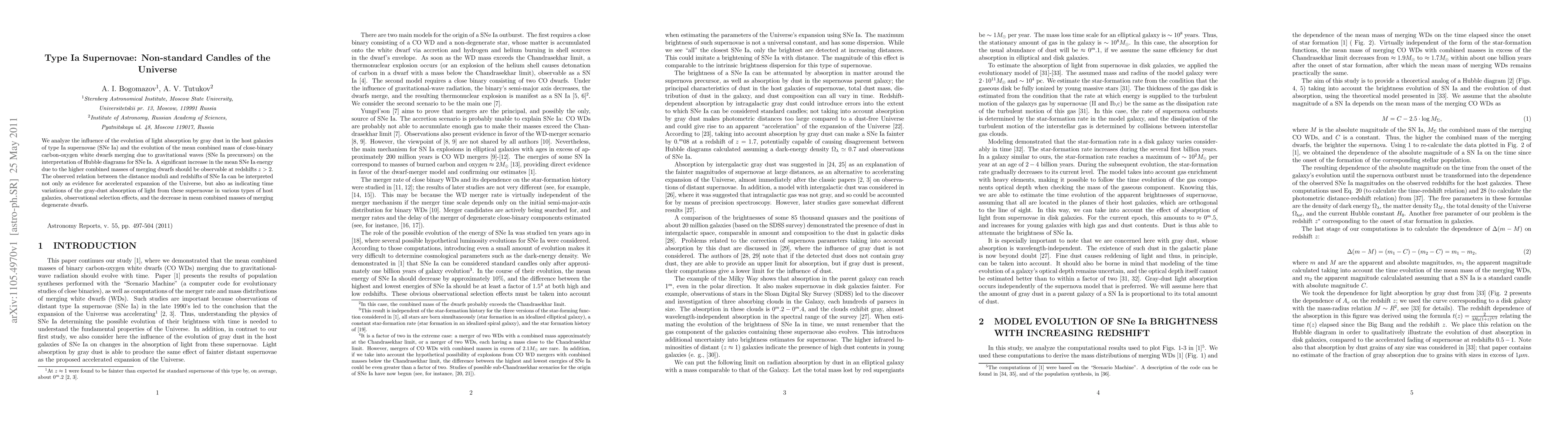 We analyze the influence of the evolution of light absorption by gray dust in the host galaxies of type Ia supernovae (SNe Ia) and the evolution of the mean combined mass of close-binary carbon-oxygen white dwarfs merging due to gravitational waves (SNe Ia precursors) on the interpretation of Hubble diagrams for SNe Ia. A significant increase in the mean SNe Ia energy due to the higher combined masses of merging dwarfs should be observable at redshifts z > 2. The observed relation between the distance moduli and redshifts of SNe Ia can be interpreted not only as evidence for accelerated expansion of the Universe, but also as indicating time variations of the gray-dust absorption of light from these supernovae in various types of host galaxies, observational selection effects, and the decrease in mean combined masses of merging degenerate dwarfs.