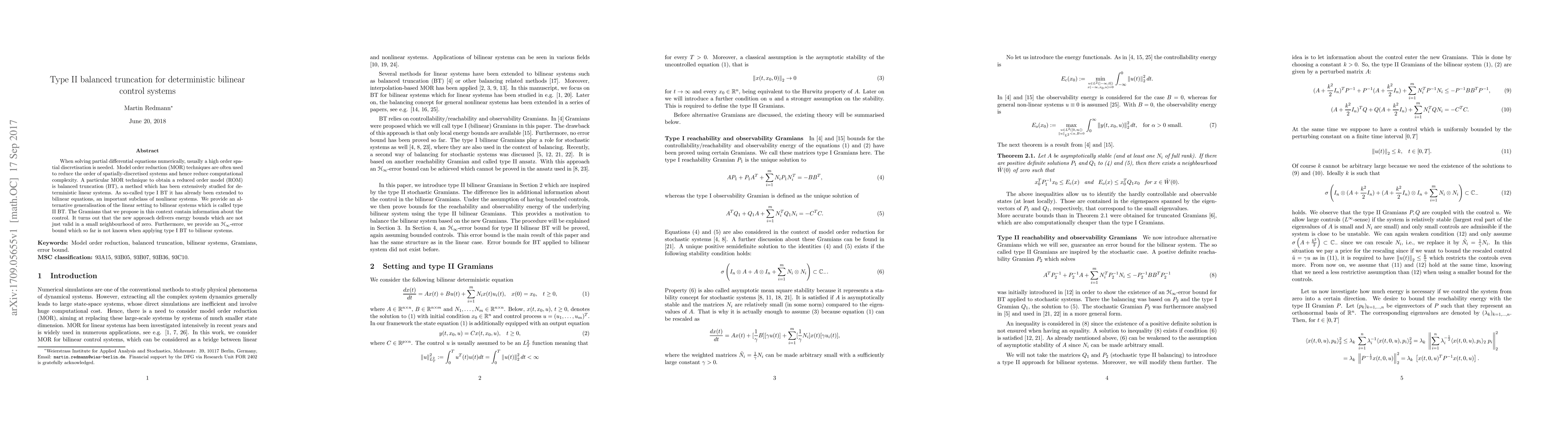 This paper introduces type II balanced truncation for reducing the order of spatially discretised bilinear control systems, providing a new method that extends beyond the small neighbourhood of zero and offers an $H_\infty$-error bound, unlike the previously used type I balanced truncation.