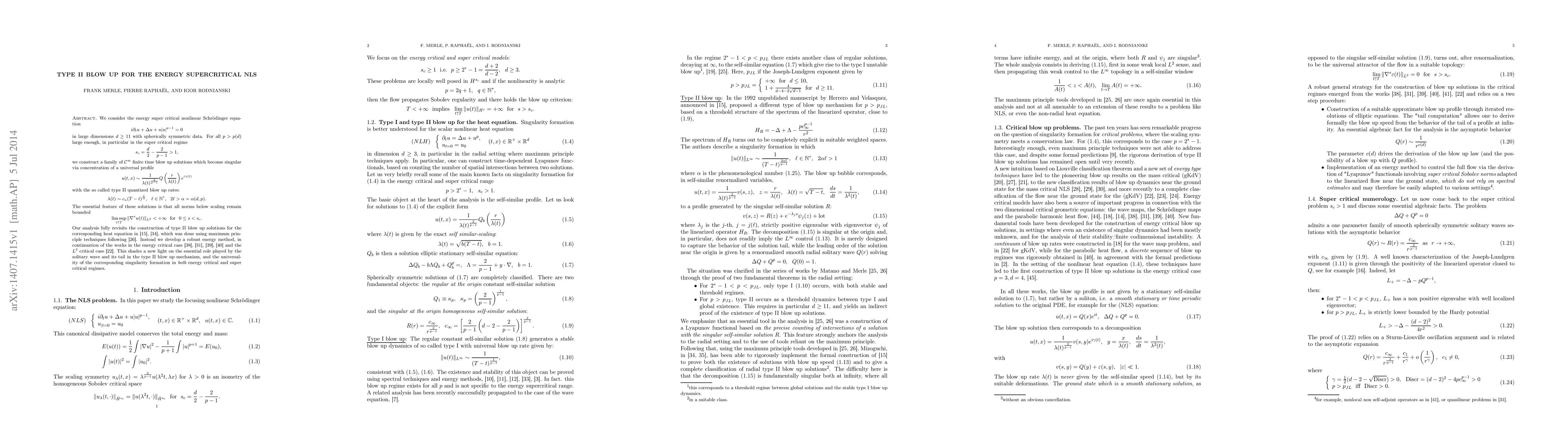 We consider the energy super critical nonlinear Schr\"odinger equation $$i\pa_tu+\Delta u+u|u|^{p-1}=0$$ in large dimensions $d\geq 11$ with spherically symmetric data. For all $p>p(d)$ large enough, in particular in the super critical regime, we construct a family of smooth finite time blow up solutions which become singular via concentration of a universal profile with the so called type II quantized blow up rates. The essential feature of these solutions is that all norms below scaling remain bounded. Our analysis fully revisits the construction of type II blow up solutions for the corresponding heat equation, which was done using maximum principle techniques following. Instead we develop a robust energy method, in continuation of the works in the energy and mass critical cases. This shades a new light on the essential role played by the solitary wave and its tail in the type II blow up mechanism, and the universality of the corresponding singularity formation in both energy critical and super critical regimes.