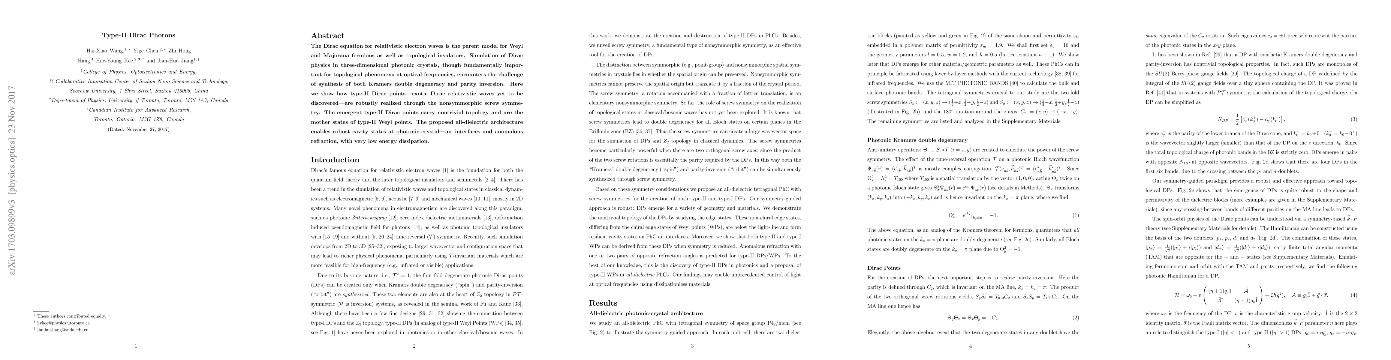 This paper demonstrates the realization of type-II Dirac points in three-dimensional photonic crystals using nonsymmorphic screw symmetry, which supports nontrivial topology and leads to type-II Weyl points. The proposed all-dielectric architecture promises low energy dissipation and potential applications in photonic devices.