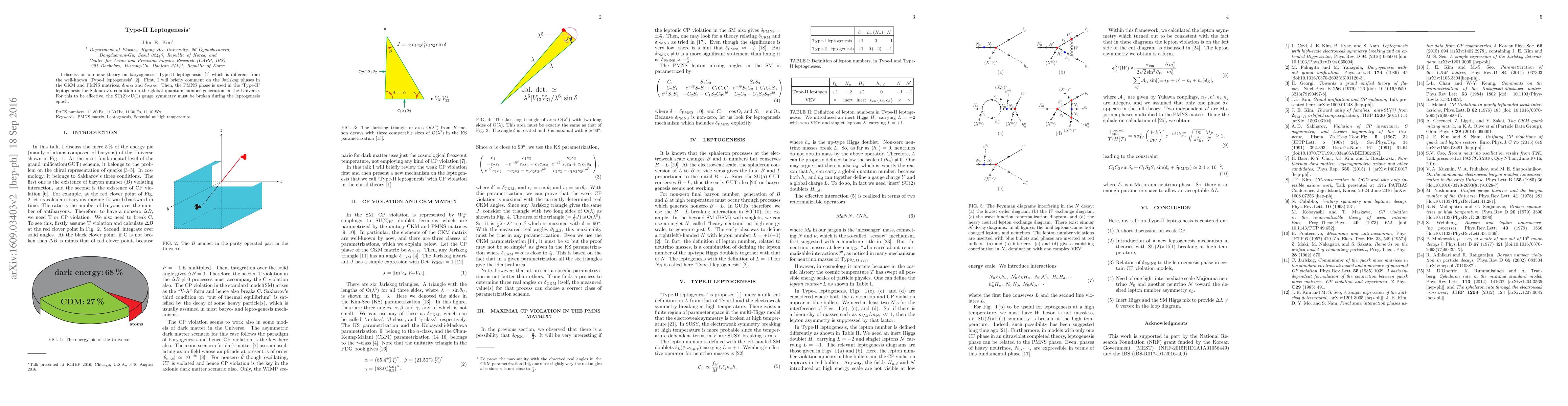 I will talk on our new theory on baryogenesis through type-II leptogenesis which is different from the well-known type-I leptogenesis. I will comment on the Jarlskog phases, $\delta_{\rm CKM}$ and $\delta_{\rm PMNS}$, in the CKM and PMNS matrices. In the type-II leptogenesis, the PMNS phase is used for Sakharov's condition on the global quantum number generation in the Universe. For this to be effective, the SU(2)$\times$U(1) gauge symmetry must be broken during the leptogenesis epoch.