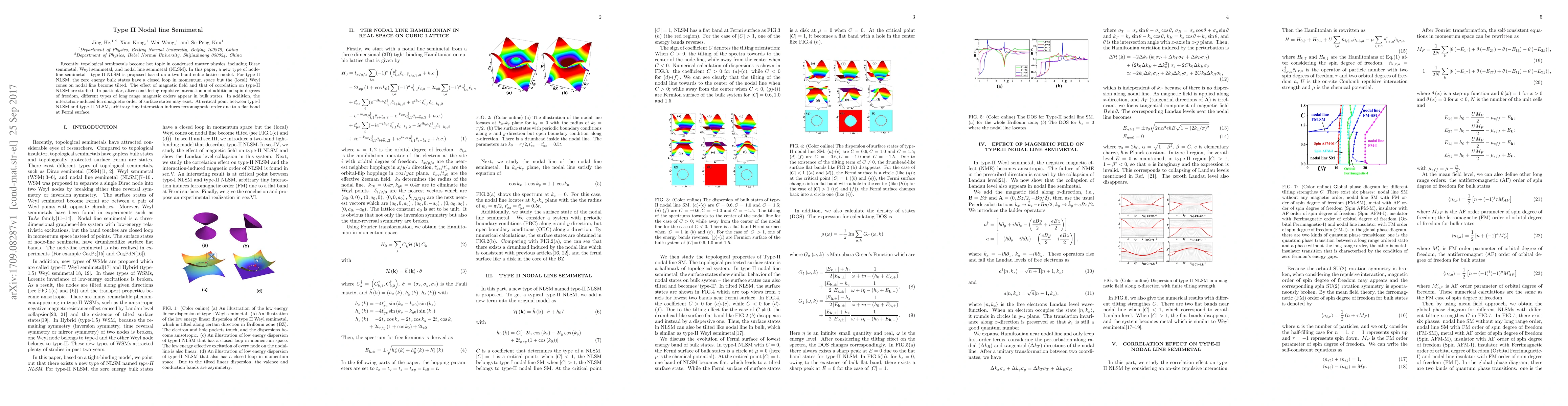 Recently, topological semimetals become hot topic in condensed matter physics, including Dirac semimetal, Weyl semimetal, and nodal line semimetal (NLSM). In this paper, a new type of node- line semimetal - type-II NLSM is proposed based on a two-band cubic lattice model. For type-II NLSM, the zero energy bulk states have a closed loop in momentum space but the (local) Weyl cones on nodal line become tilted. The effect of magnetic field and that of correlation on type-II NLSM are studied. In particular, after considering repulsive interaction and additional spin degrees of freedom, different types of long range magnetic orders appear in bulk states. In addition, the interaction-induced ferromagnetic order of surface states may exist. At critical point between type-I NLSM and type-II NLSM, arbitrary tiny interaction induces ferromagnetic order due to a flat band at Fermi surface.