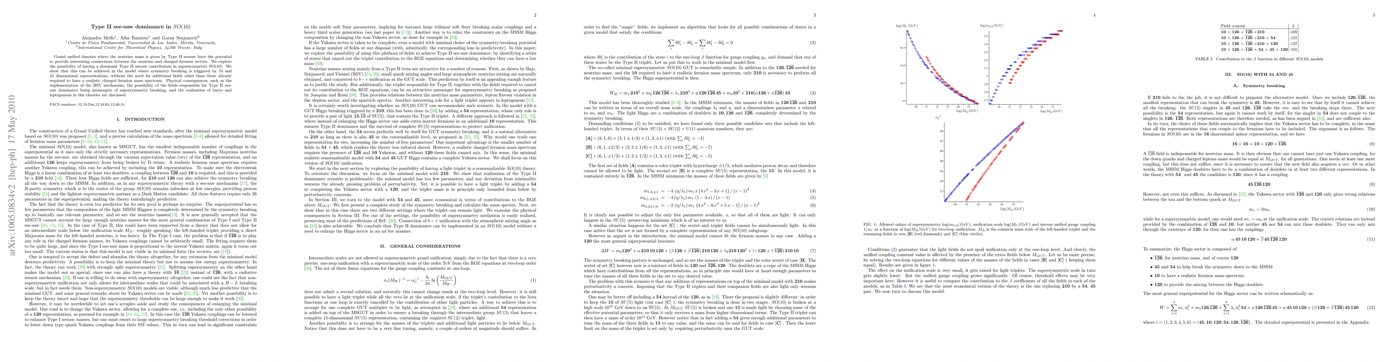 This paper explores a supersymmetric SO(10) model with dominant Type II seesaw dominance, achieved through symmetry breaking by 54 and 45-dimensional representations, without extra fields. It discusses physical consequences including the BSV mechanism, potential supersymmetry breaking messengers, and baryo/leptogenesis.