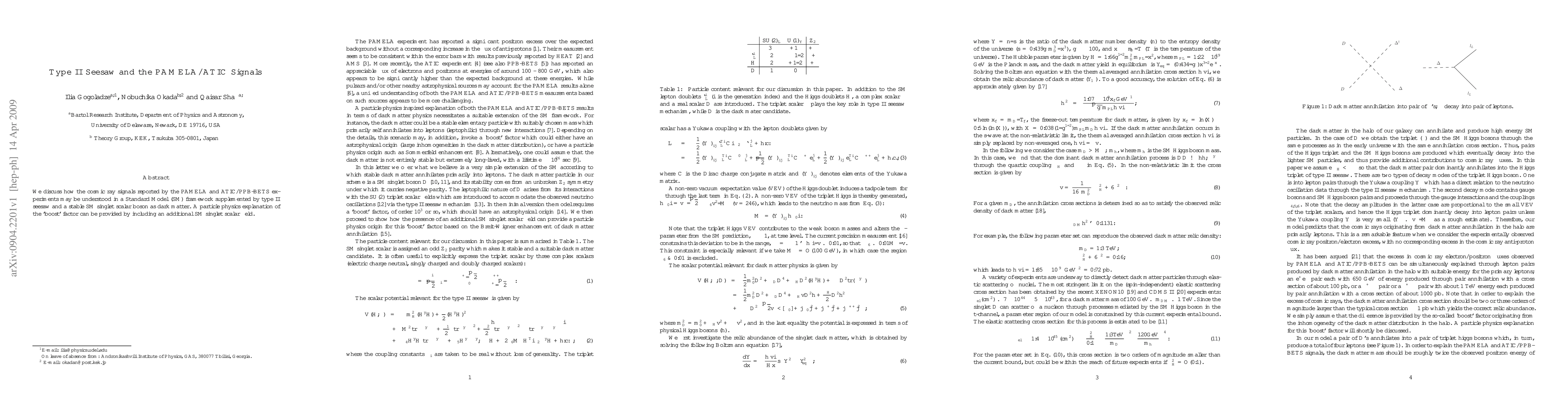 We discuss how the cosmic ray signals reported by the PAMELA and ATIC/PPB-BETS experiments may be understood in a Standard Model (SM) framework supplemented by type II seesaw and a stable SM singlet scalar boson as dark matter. A particle physics explanation of the 'boost' factor can be provided by including an additional SM singlet scalar field.