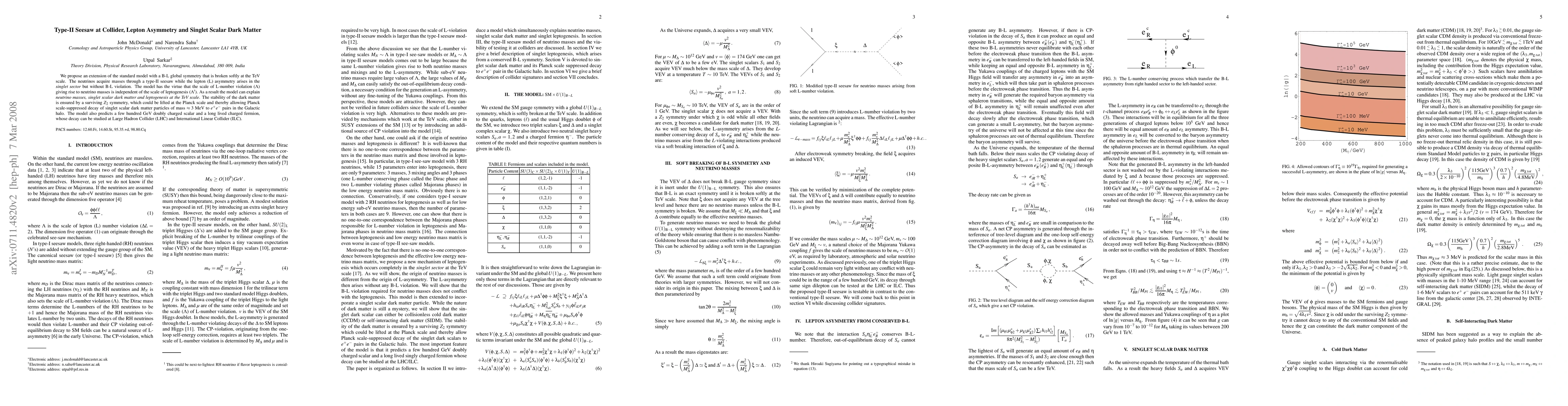 This paper proposes an extended standard model with a B-L symmetry broken at the TeV scale, explaining neutrino masses via type-II seesaw, singlet scalar dark matter, and leptogenesis at the same scale. The model predicts observable doubly charged scalars and a long-lived charged fermion at colliders.