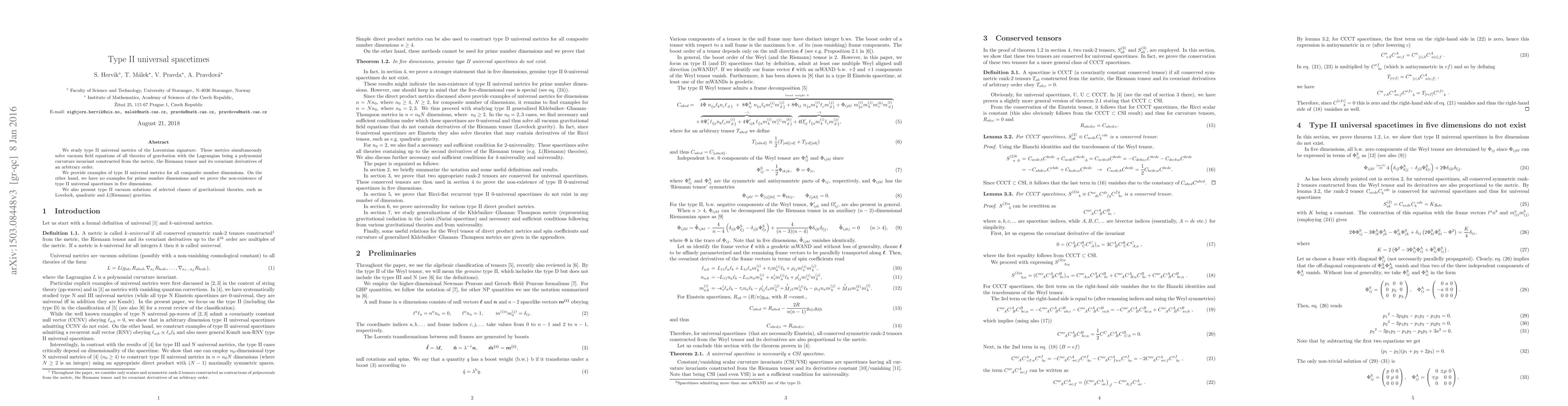 Researchers found type II universal spacetimes that solve vacuum field equations for various gravitation theories in dimensions with composite numbers of dimensions, but could not find examples or prove non-existence for prime number dimensions.