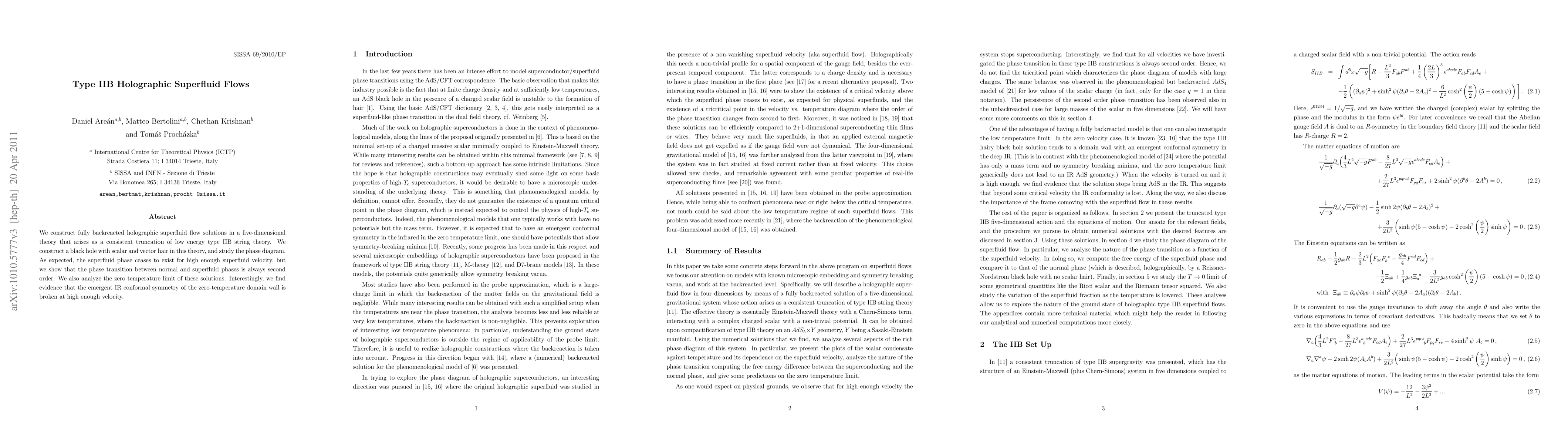 We construct fully backreacted holographic superfluid flow solutions in a five-dimensional theory that arises as a consistent truncation of low energy type IIB string theory. We construct a black hole with scalar and vector hair in this theory, and study the phase diagram. As expected, the superfluid phase ceases to exist for high enough superfluid velocity, but we show that the phase transition between normal and superfluid phases is always second order. We also analyze the zero temperature limit of these solutions. Interestingly, we find evidence that the emergent IR conformal symmetry of the zero-temperature domain wall is broken at high enough velocity.