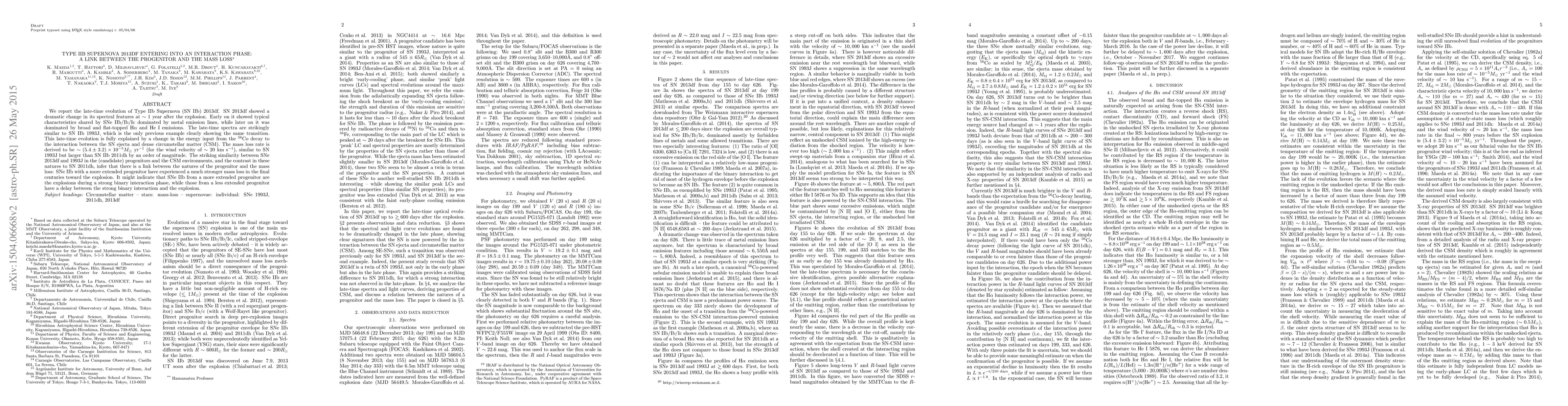 The research paper reports on the late-time evolution of Type IIb Supernova 2013df, noting a dramatic shift in spectral features around one year post-explosion. This change is attributed to the transition from $^{56}$Co decay energy to interaction with dense circumstellar matter (CSM). The mass loss rate is estimated to be ~5.4 x 10^-5 Msun/yr, similar to SN 1993J but greater than SN 2011dh. The findings suggest a link between progenitor size and mass loss, implying SNe IIb from extended progenitors may result from ongoing strong binary interactions, while those from less extended progenitors may have a delay between such interactions and the explosion.