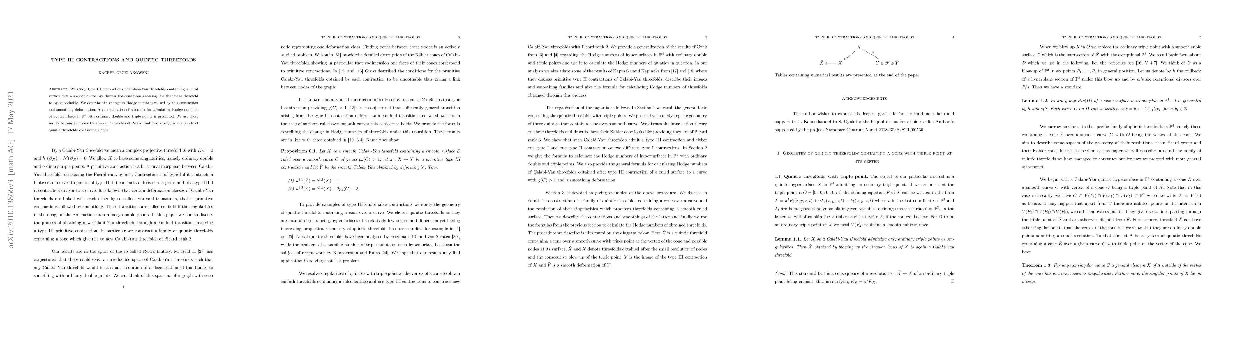 We study type III contractions of Calabi-Yau threefolds containing a ruled surface over a smooth curve. We discuss the conditions necessary for the image threefold to by smoothable. We describe the change in Hodge numbers caused by this contraction and smoothing deformation. A generalization of a fomula for calculating Hodge numbers of hypersurfaces in $\mathbb{P}^4$ with ordinary double and triple points is presented. We use these results to construct new Calabi-Yau threefolds of Picard rank two arising from a family of quintic threefolds containing a cone.