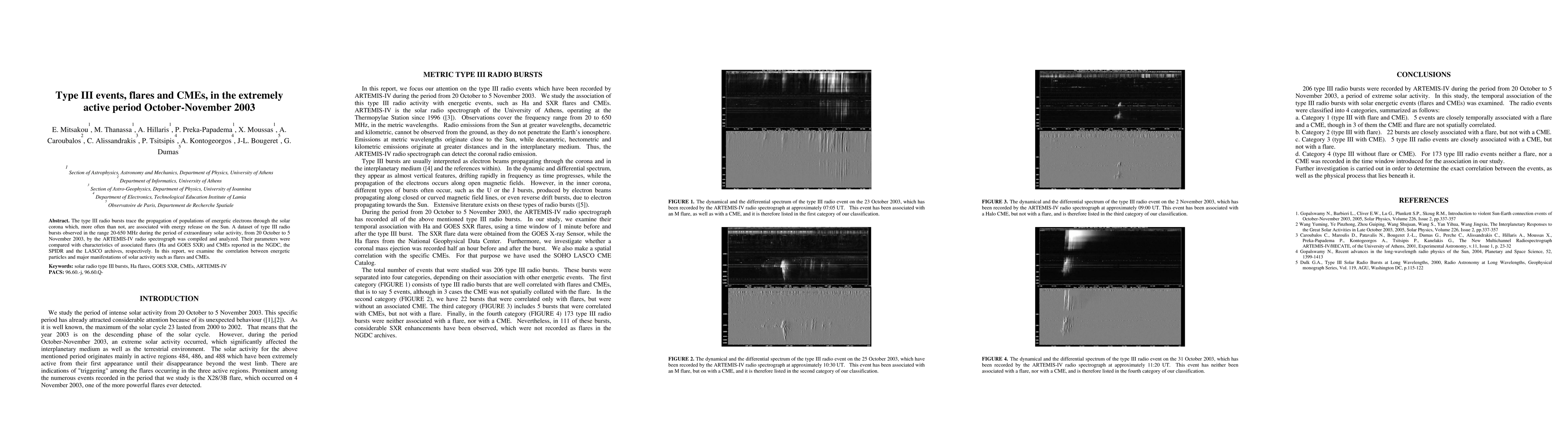 A study analyzed Type III events and their association with solar flares and coronal mass ejections during an extremely active period in 2003, finding a correlation between the energetic particles and major solar activity manifestations.