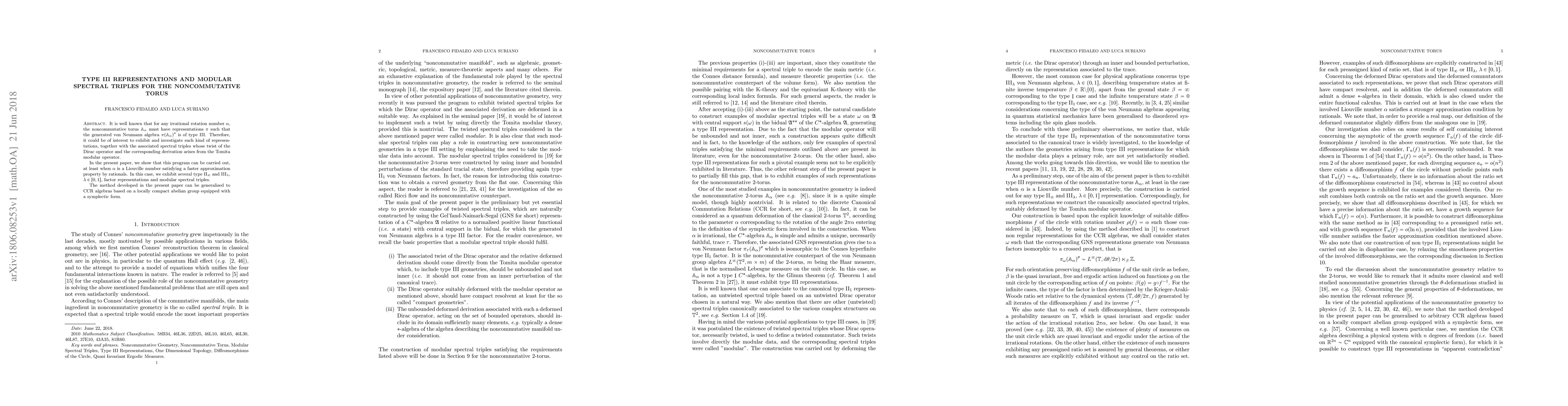 This paper explores type III representations of the noncommutative torus $\ba_\a$ for irrational rotation numbers $\a$, particularly focusing on Liouville numbers with enhanced rational approximation properties. It demonstrates the existence of type II_∞ and III_λ factor representations and associated modular spectral triples, and extends the method to CCR algebras based on locally compact abelian groups with symplectic forms.