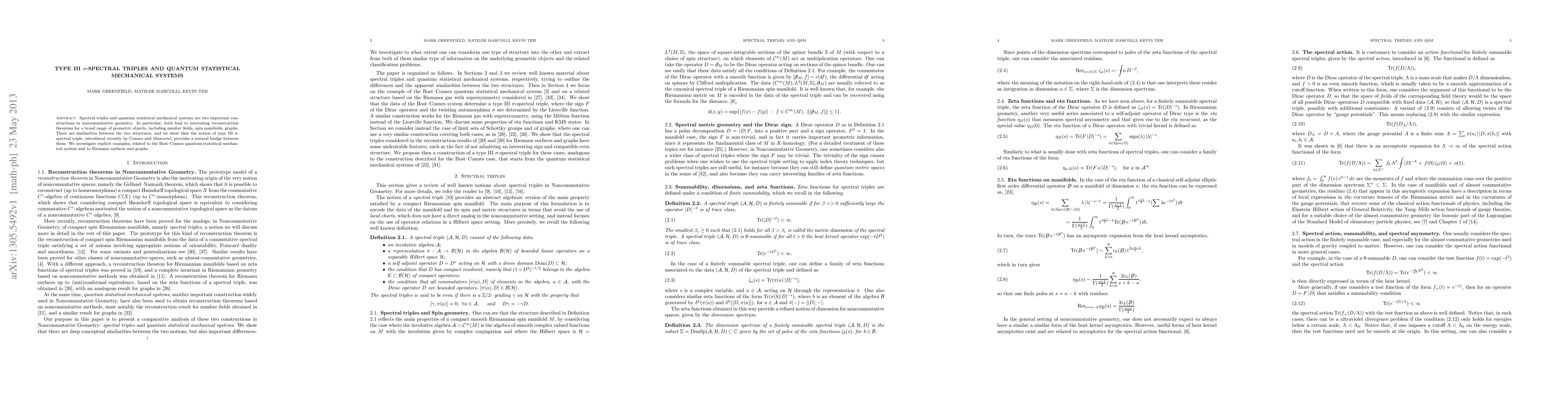 This paper explores the connection between type III sigma-spectral triples and quantum statistical mechanical systems, demonstrating how the former bridges the gap between these two noncommutative geometry constructs. The study provides explicit examples involving the Bost-Connes system and Riemann surfaces, highlighting the reconstruction theorems applicable to various geometric objects.