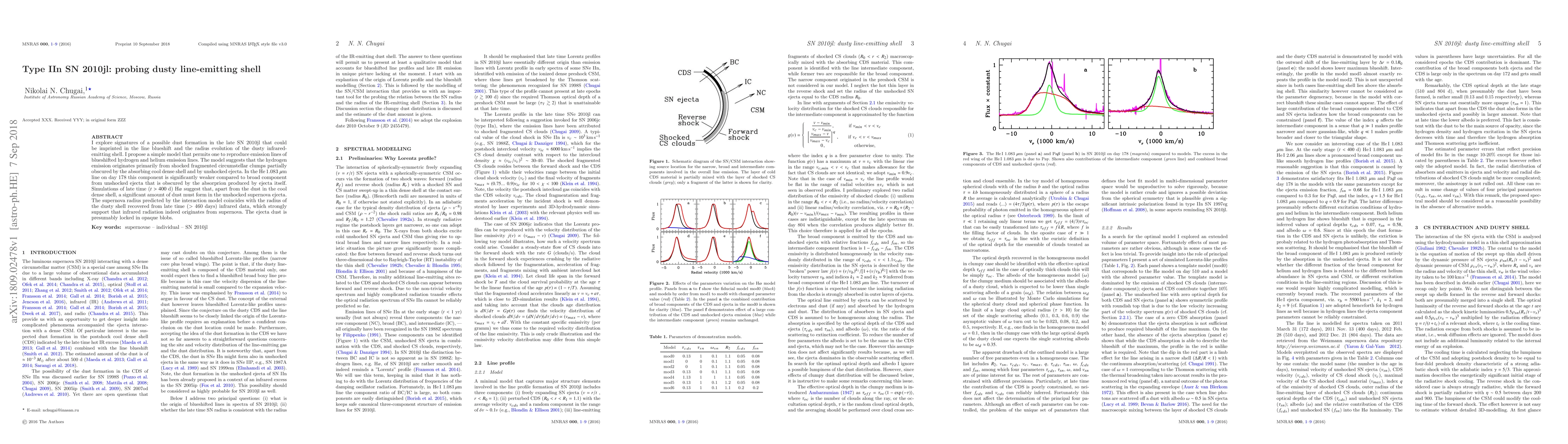 The research examines SN 2010jl, suggesting late-time dust formation in its ejecta and circumstellar material. A model is proposed to explain blueshifted hydrogen and helium emission lines, indicating that hydrogen originates from fragmented clumps obscured by a cool dense shell. Late infrared data supports the model, showing that supernova radius aligns with the dusty shell's radius, implying infrared emission originates from the supernova itself. The study concludes that a significant amount of dust forms in both the cool dense shell and unshocked ejecta, likely locked in opaque blobs.