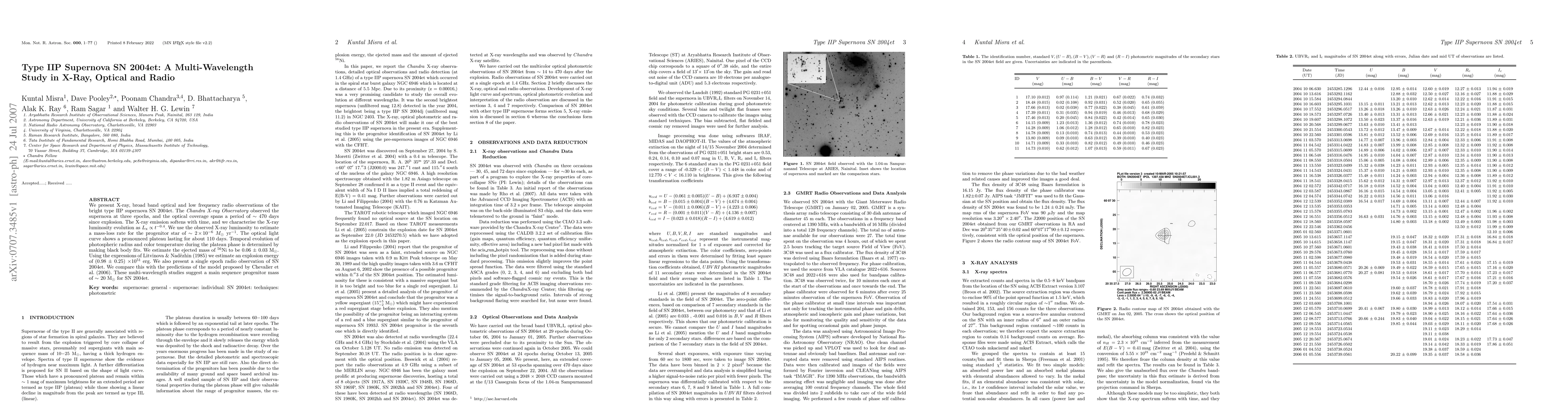 This study observes type IIP supernova SN 2004et in X-ray, optical, and radio wavelengths, estimating a main sequence progenitor mass of ~20 M$_ odot$.