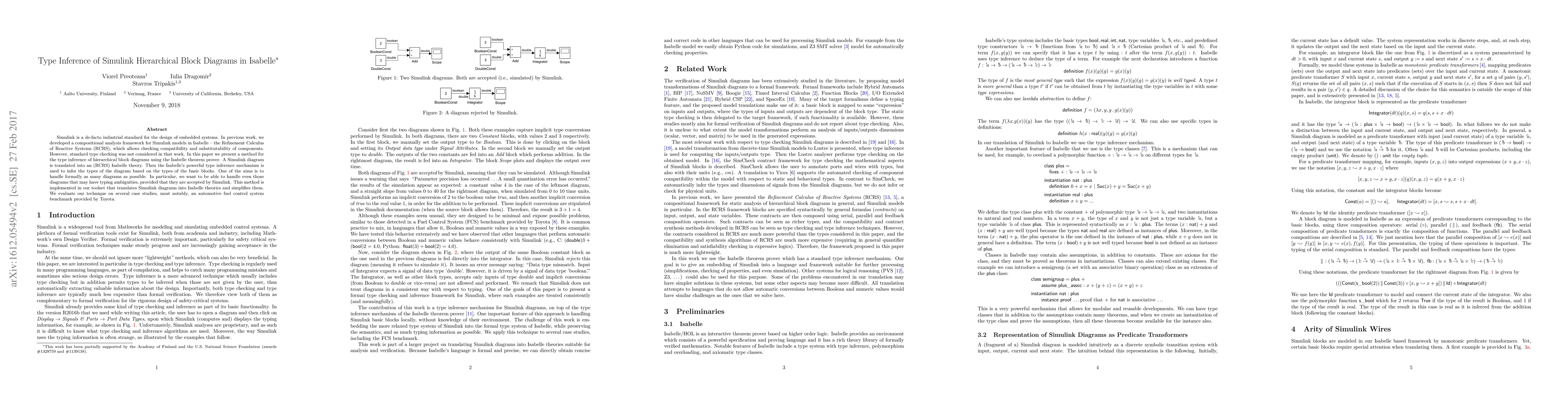 This paper introduces a method for type inference in Simulink hierarchical block diagrams using the Isabelle theorem prover, translating Simulink models into an Isabelle theory and leveraging its type inference to handle complex diagrams, including those with typing ambiguities. The technique is evaluated on a Toyota automotive fuel control system benchmark.