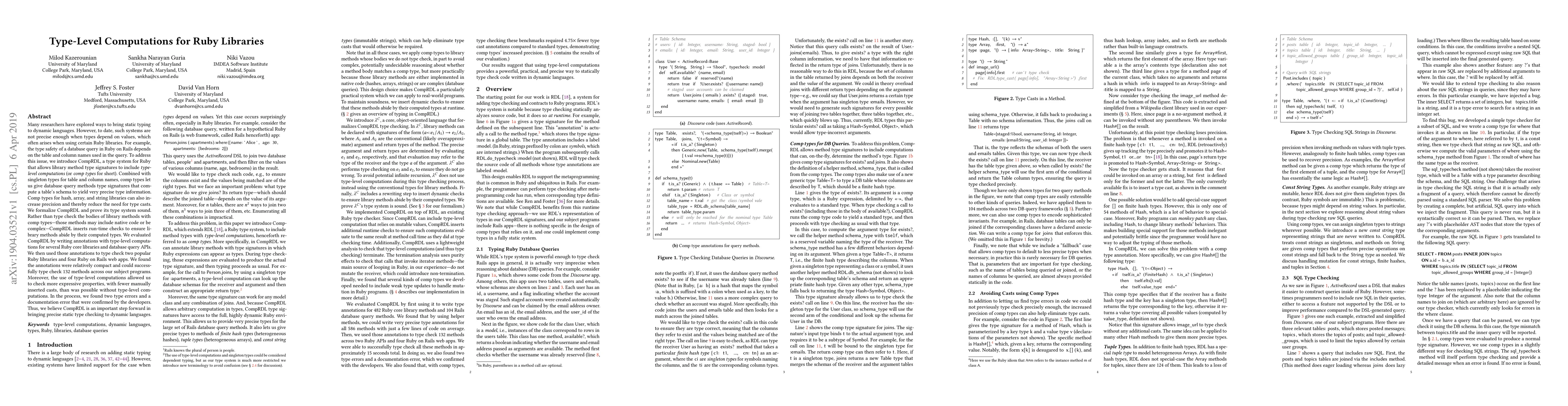 CompRDL introduces a type system for Ruby that enables type signatures to include type-level computations, enhancing precision in type checking for libraries like database query methods. The system inserts run-time checks instead of static checks, successfully type checking 132 methods and uncovering two type errors and a documentation error.