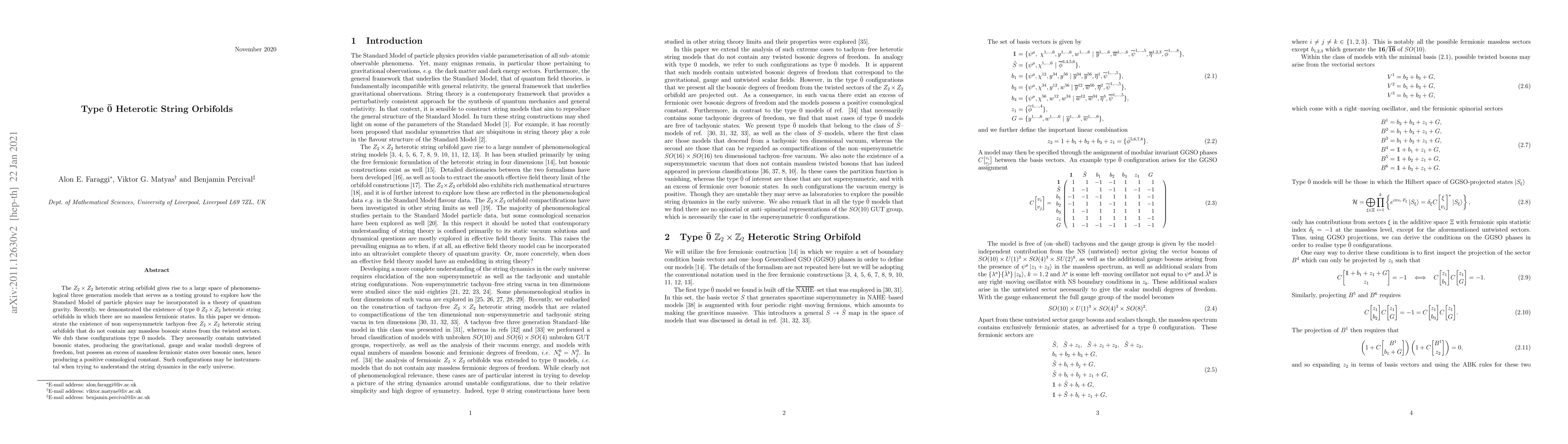 The $Z_2\times Z_2$ heterotic string orbifold gives rise to a large space of phenomenological three generation models that serves as a testing ground to explore how the Standard Model of particle physics may be incorporated in a theory of quantum gravity. Recently, we demonstrated the existence of type 0 $Z_2\times Z_2$ heterotic string orbifolds in which there are no massless fermionic states. In this paper we demonstrate the existence of non--supersymmetric tachyon--free $Z_2\times Z_2$ heterotic string orbifolds that do not contain any massless bosonic states from the twisted sectors. We dub these configurations type ${\bar 0}$ models. They necessarily contain untwisted bosonic states, producing the gravitational, gauge and scalar moduli degrees of freedom, but possess an excess of massless fermionic states over bosonic ones, hence producing a positive cosmological constant. Such configurations may be instrumental when trying to understand the string dynamics in the early universe.