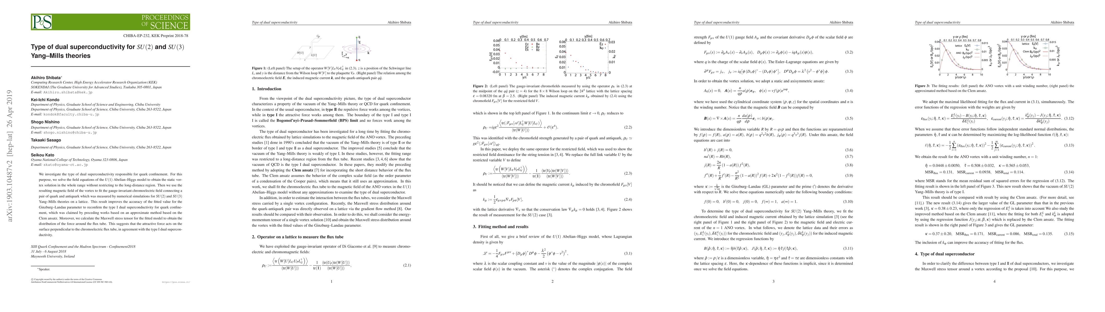 We investigate the type of dual superconductivity responsible for quark confinement. For this purpose, we solve the field equations of the $U(1)$ Abelian--Higgs model to obtain the static vortex solution in the whole range without restricting to the long-distance region. Then we use the resulting magnetic field of the vortex to fit the gauge-invariant chromoelectric field connecting a pair of quark and antiquark which was measured by numerical simulations for $SU(2)$ and $SU(3)$ Yang--Mills theories on a lattice. This result improves the accuracy of the fitted value for the Ginzburg--Landau parameter to reconfirm the type I dual superconductivity for quark confinement, which was claimed by preceding works based on an approximate method based on the Clem ansatz. Moreover, we calculate the Maxwell stress tensor for the fitted model to obtain the distribution of the force around the flux tube. This suggests that the attractive force acts on the surface perpendicular to the chromoelectric flux tube, in agreement with the type I dual superconductivity.