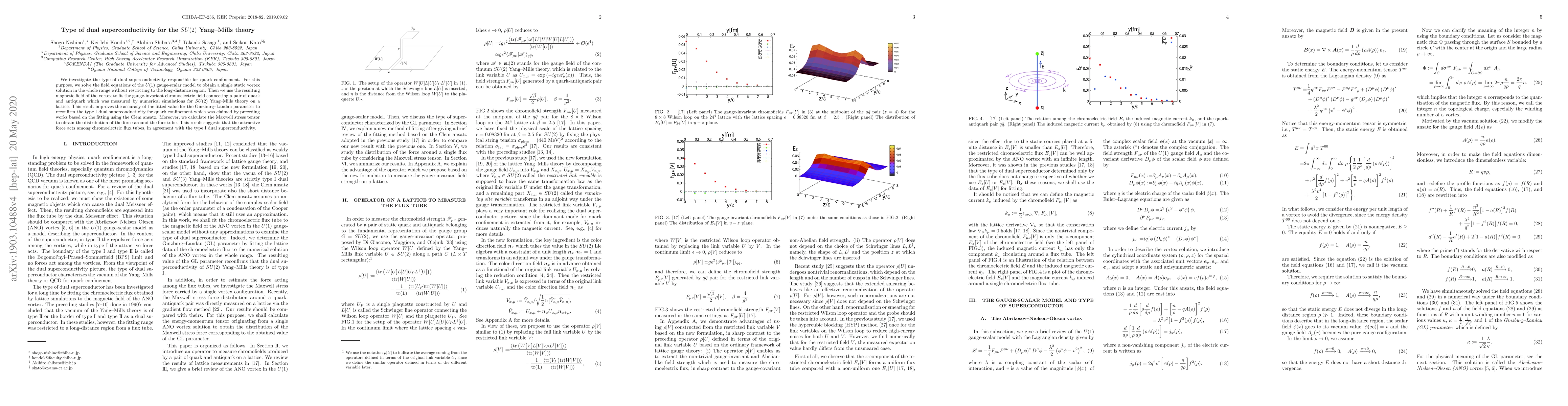 We investigate the type of dual superconductivity responsible for quark confinement. For this purpose, we solve the field equations of the $U(1)$ gauge-scalar model to obtain the static vortex solution in the whole range without restricting to the long-distance region. Then we use the resulting magnetic field of the vortex to fit the gauge-invariant chromoelectric field connecting a pair of quark and antiquark which was measured by numerical simulations for $SU(2)$ Yang--Mills theory on a lattice. This result improves the accuracy of the fitted value for the Ginzburg--Landau parameter to reconfirm the type I dual superconductivity for quark confinement which was claimed by preceding works based on a fitting using the Clem ansatz. Moreover, we calculate the Maxwell stress tensor to obtain the distribution of the force around the flux tube. This result suggests that the attractive force acts among chromoelectric flux tubes, in agreement with the type I dual superconductivity.