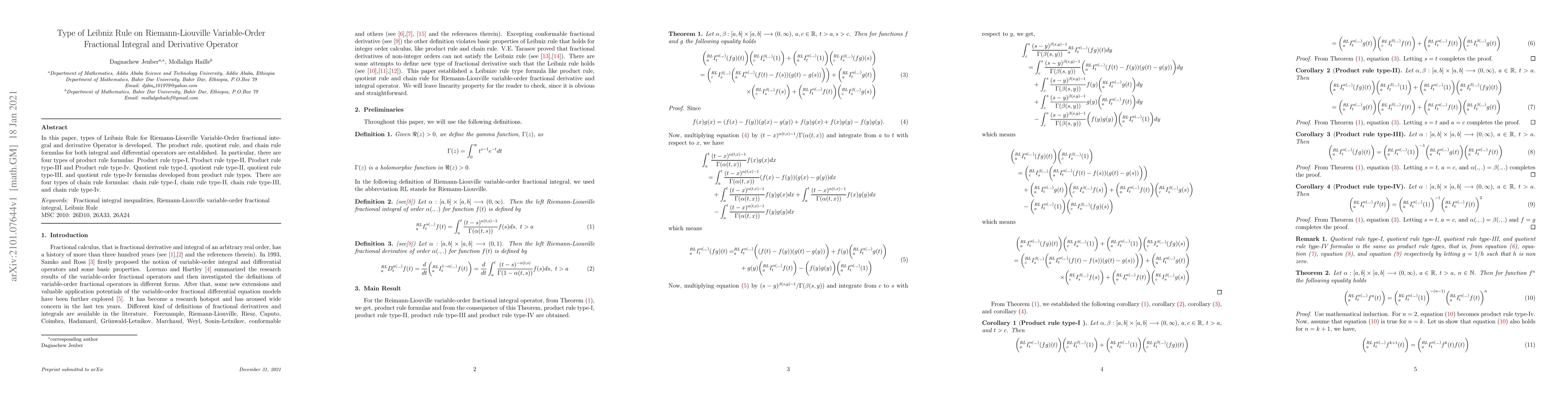 The paper develops types of Leibniz Rule for Riemann-Liouville Variable-Order fractional integral and derivative operator, establishing product, quotient, and chain rule formulas for both integral and differential operators.