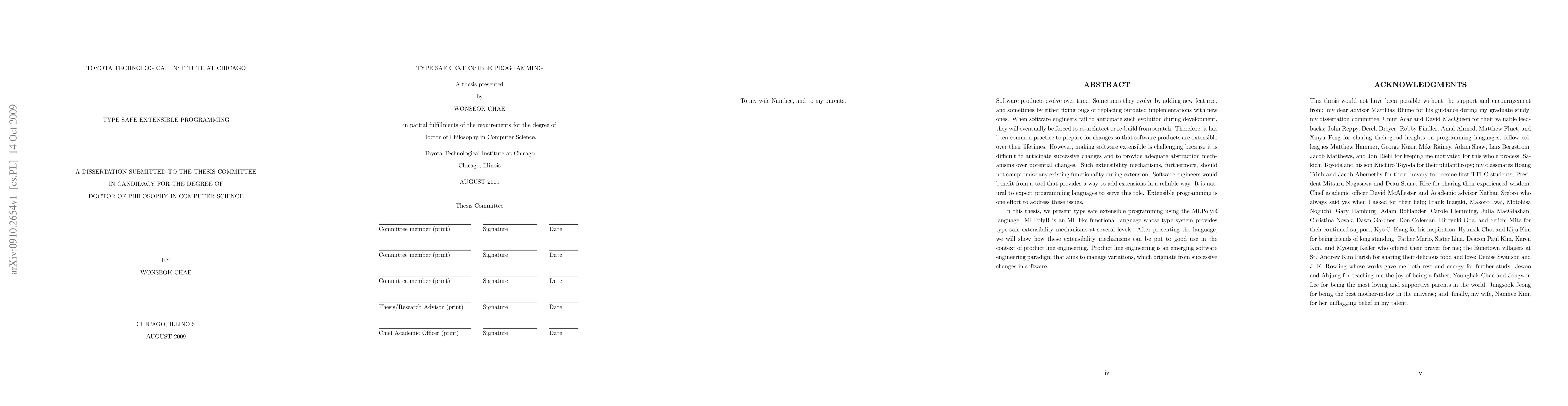 Software products evolve over time. Sometimes they evolve by adding new features, and sometimes by either fixing bugs or replacing outdated implementations with new ones. When software engineers fail to anticipate such evolution during development, they will eventually be forced to re-architect or re-build from scratch. Therefore, it has been common practice to prepare for changes so that software products are extensible over their lifetimes. However, making software extensible is challenging because it is difficult to anticipate successive changes and to provide adequate abstraction mechanisms over potential changes. Such extensibility mechanisms, furthermore, should not compromise any existing functionality during extension. Software engineers would benefit from a tool that provides a way to add extensions in a reliable way. It is natural to expect programming languages to serve this role. Extensible programming is one effort to address these issues. In this thesis, we present type safe extensible programming using the MLPolyR language. MLPolyR is an ML-like functional language whose type system provides type-safe extensibility mechanisms at several levels. After presenting the language, we will show how these extensibility mechanisms can be put to good use in the context of product line engineering. Product line engineering is an emerging software engineering paradigm that aims to manage variations, which originate from successive changes in software.