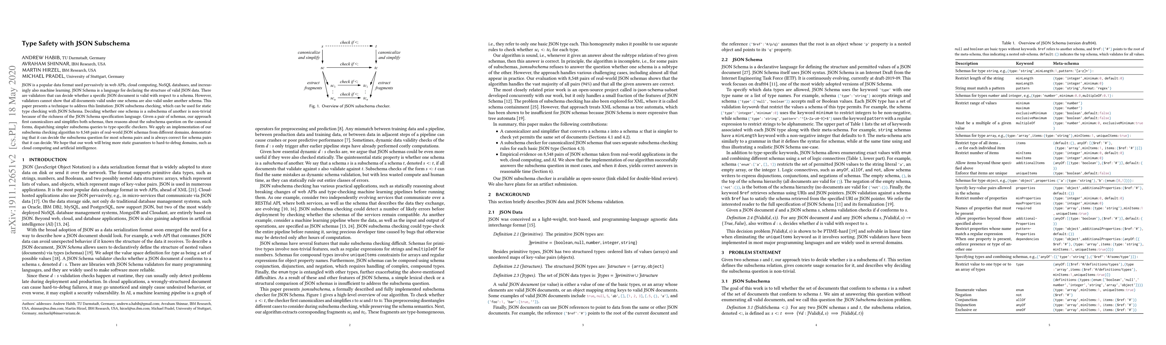 This paper introduces JSON subschema checking for static type safety in JSON Schema, addressing the limitations of instance-based validation. The method canonicalizes and simplifies schemas before deciding subschema relationships, and is shown to be effective and correct on a large dataset of real-world schemas.