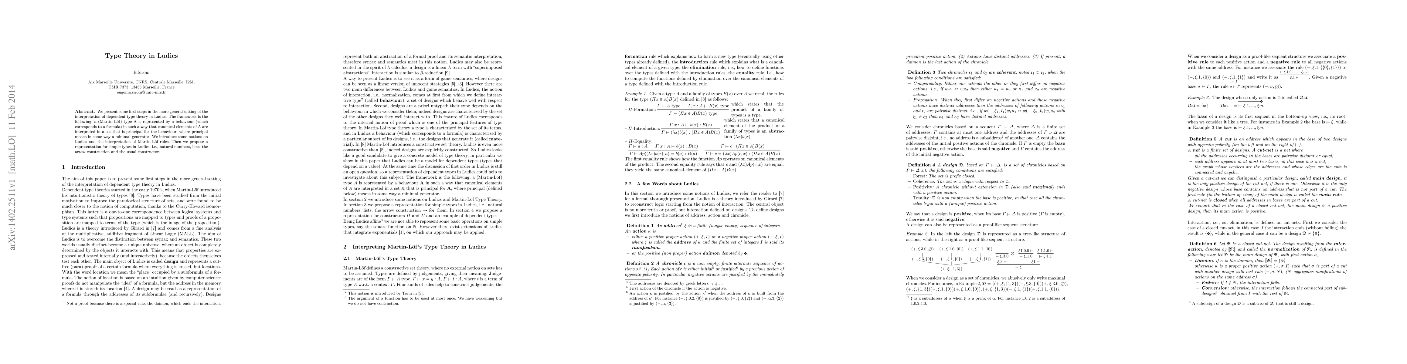 This paper explores the interpretation of dependent type theory within the Ludics framework, representing Martin-Lof types as behaviors and proposing a representation for simple types like natural numbers, lists, and arrows.