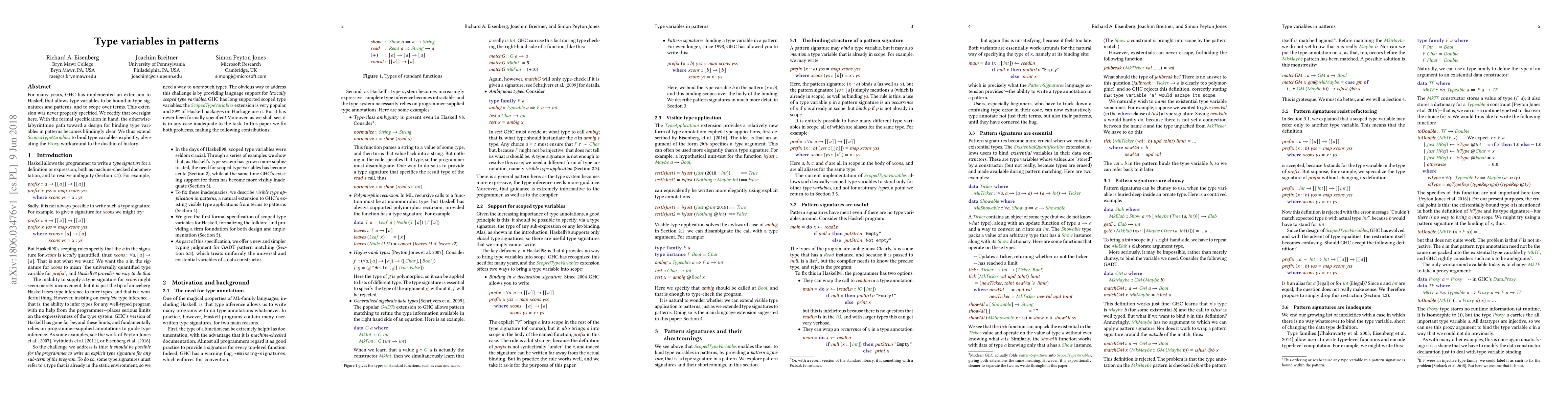 Researchers formalize a Haskell extension allowing explicit binding of type variables in patterns, simplifying a previously unresolved issue with ScopedTypeVariables.