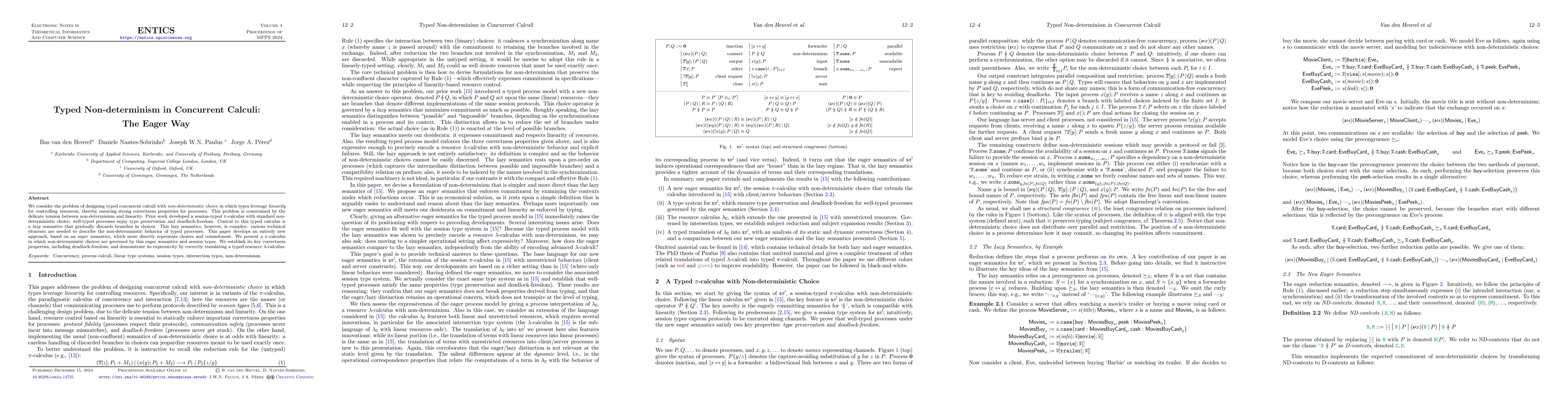 This paper introduces a new typed concurrent calculus with an eager semantics for non-deterministic choices, leveraging session types to ensure strong correctness properties such as deadlock-freedom, contrasting with the complex lazy semantics of prior work.
