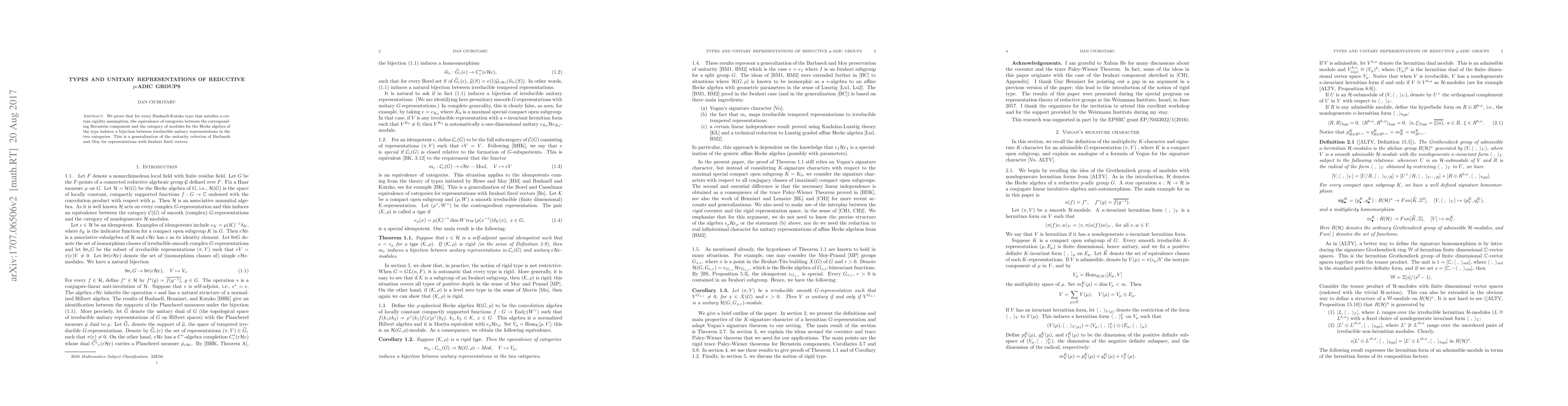 This paper proves a bijection between irreducible unitary representations in Bernstein components and modules for the Hecke algebra, generalizing the unitarity criterion for Iwahori fixed vector representations. The result applies to Bushnell-Kutzko types meeting a specified rigidity condition.